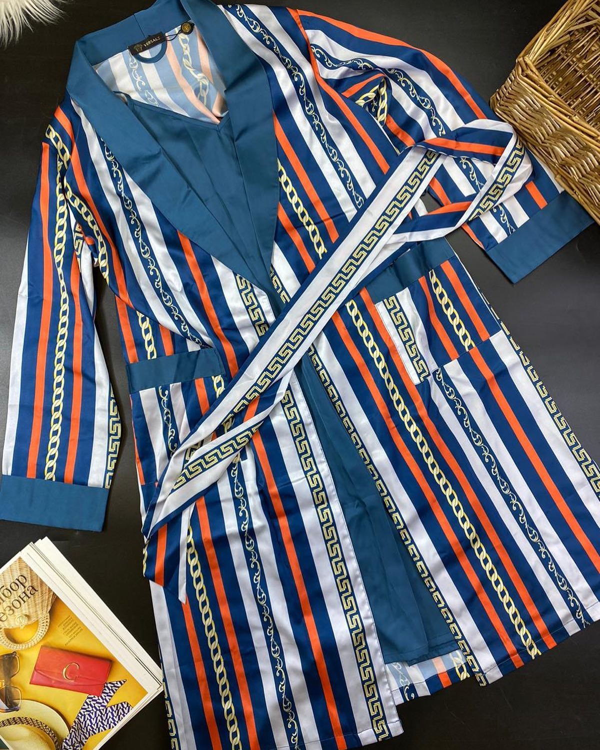 Комплект Versace LUX-35302 представляет собой элегантный домашний халат, выполненный в узнаваемом стиле бренда. Яркая полосатая расцветка с элементами золотых цепей и греческого орнамента придает изделию роскошный вид. Идеально подходит для создания расслабленного, но в то же время изысканного домашнего образа.