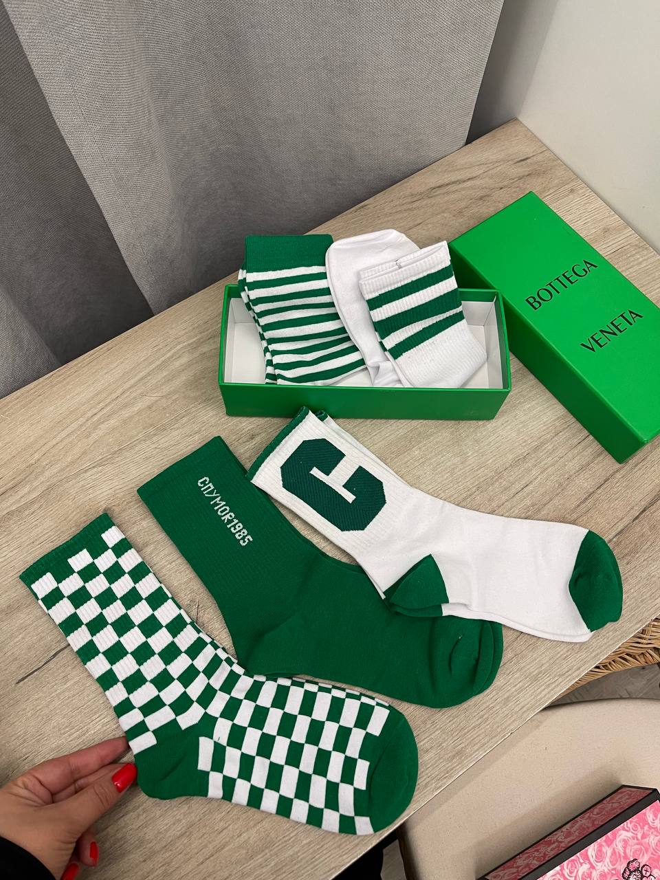 Комплект носков Bottega Veneta LUX-102382 представляет собой стильный аксессуар, который добавит изюминку в ваш образ. Комплект включает в себя несколько пар носков разного дизайна в зелено-белой цветовой гамме. Разнообразие узоров и оттенков позволяет легко подобрать пару под любой наряд.