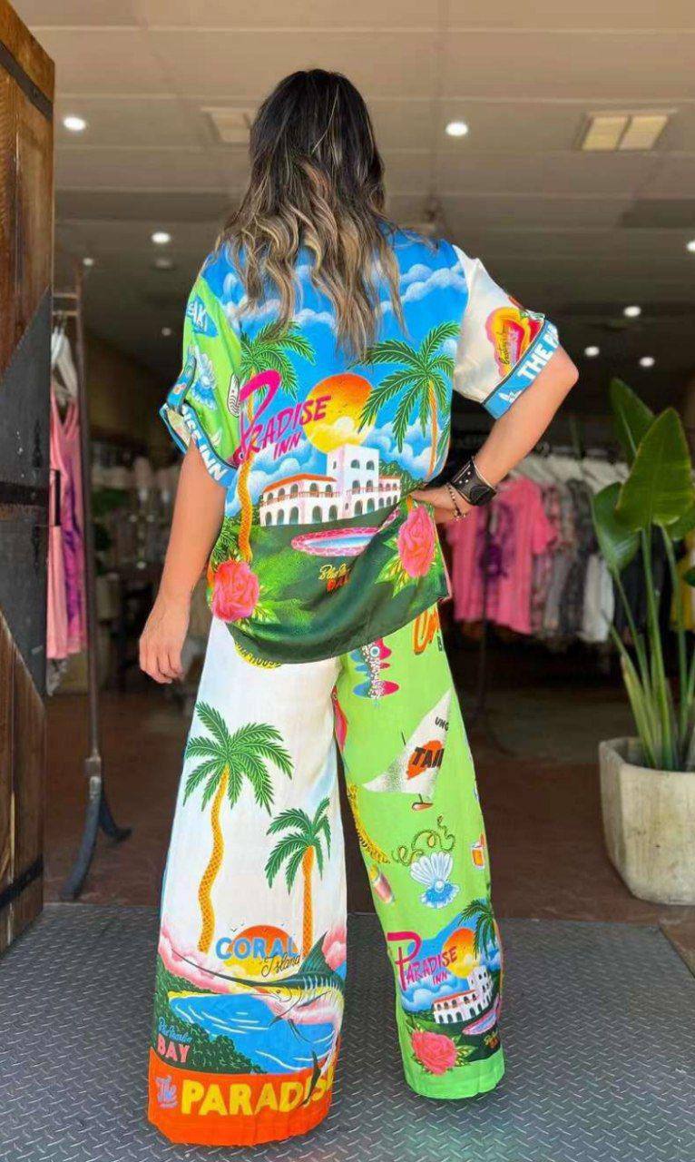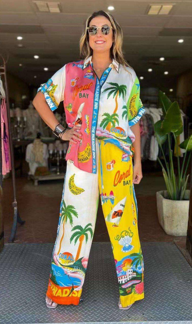 Костюм женский LUX-119909 — это яркий летний комплект, состоящий из рубашки с коротким рукавом и широких брюк, выполненный в тропическом стиле. Основными цветами костюма являются розовый, белый и желтый, украшенные красочными принтами с пальмами, бананами и морскими мотивами. Этот костюм идеально подойдет для создания расслабленных и стильных образов на отдыхе или в городе.
