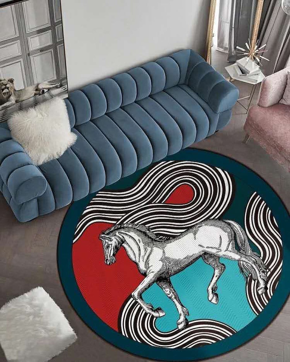 Представляем ковер LUX-42886, стильное дополнение к любому интерьеру. Этот круглый ковер с изображением бегущей лошади в окружении абстрактных линий и цветовых блоков станет ярким акцентом в вашей гостиной или спальне. Он идеально подходит для создания уникальной атмосферы и придания пространству динамичности.