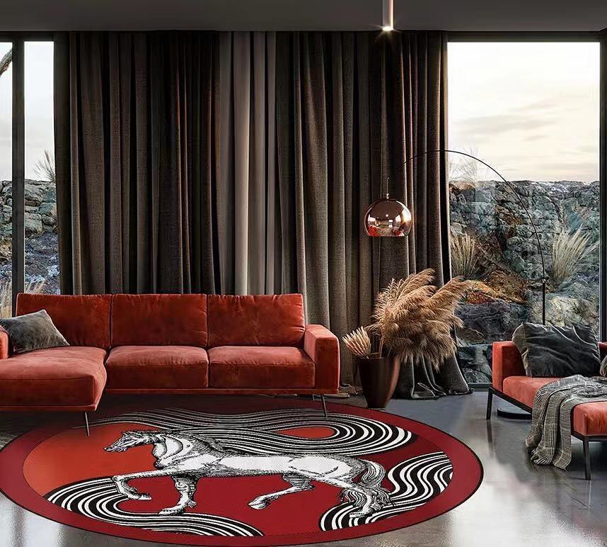 Круглый ковер LUX-42887 с изображением белого коня на красном фоне и стилизованными волнами привнесет изысканность и динамику в ваш интерьер. Этот дизайнерский ковер идеально подойдет для создания акцента в гостиной или спальне, добавляя элемент роскоши и уникальности.