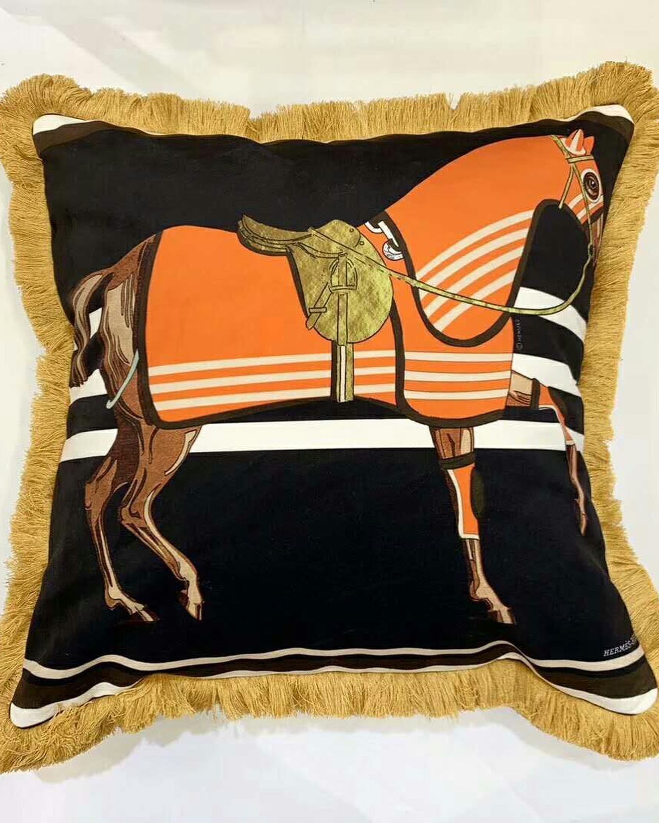 Наволочка для декоративной подушки LUX-31606 от Hermes представляет собой стильный элемент интерьера, выполненный в элегантном стиле. Черный фон подчеркивает яркий принт с изображением лошади в оранжевом попоне, украшенном полосами, и золотистой сбруей. Сочетание классических мотивов и современных цветовых решений делает ее прекрасным дополнением для создания изысканной атмосферы в вашем доме.