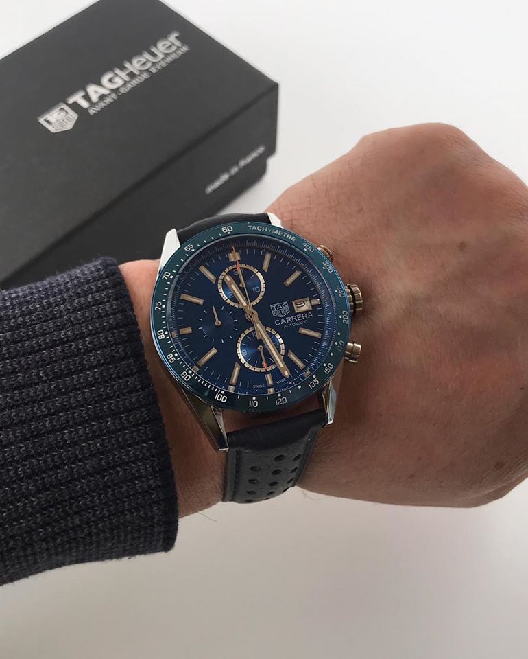 Представляем элегантные мужские часы TAG Heuer Carrera, сочетающие в себе спортивный стиль и роскошь. Этот хронограф с синим циферблатом и золотистыми акцентами станет идеальным аксессуаром для современного мужчины, ценящего точность и безупречный внешний вид. Часы прекрасно дополнят как деловой костюм, так и повседневный образ.
