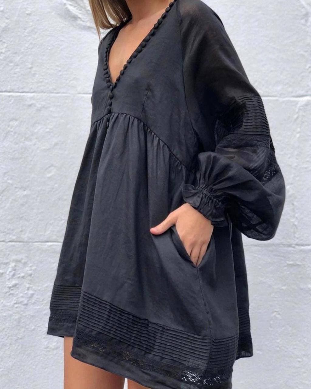 Это короткое платье-трапеция от LUX-CRIME, артикул LUX-53814, выполнено в черном цвете. Модель отличается V-образным вырезом, украшенным декоративными пуговицами, и объемными рукавами с манжетами на резинке. Платье имеет присборенную талию, от которой расклешается вниз, и декорировано широкой планкой с плиссировкой и кружевом по подолу.