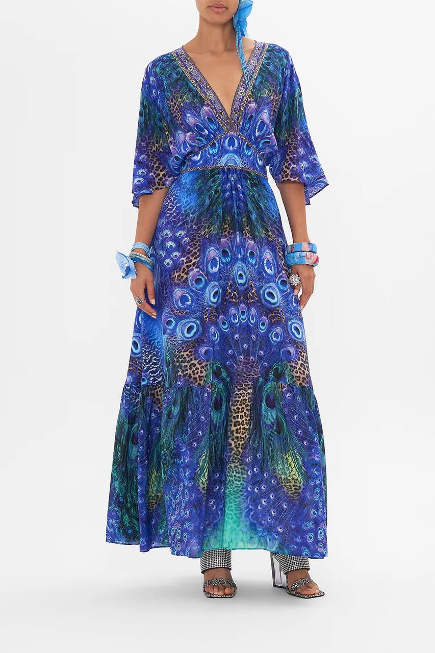 Платье Camilla (артикул LUX-106099) — это яркий представитель богемного стиля. Платье выполнено в глубоких синих тонах с акцентом на эффектный принт в виде павлиньих перьев. Модель с V-образным вырезом, расклешенными рукавами и свободной посадкой.