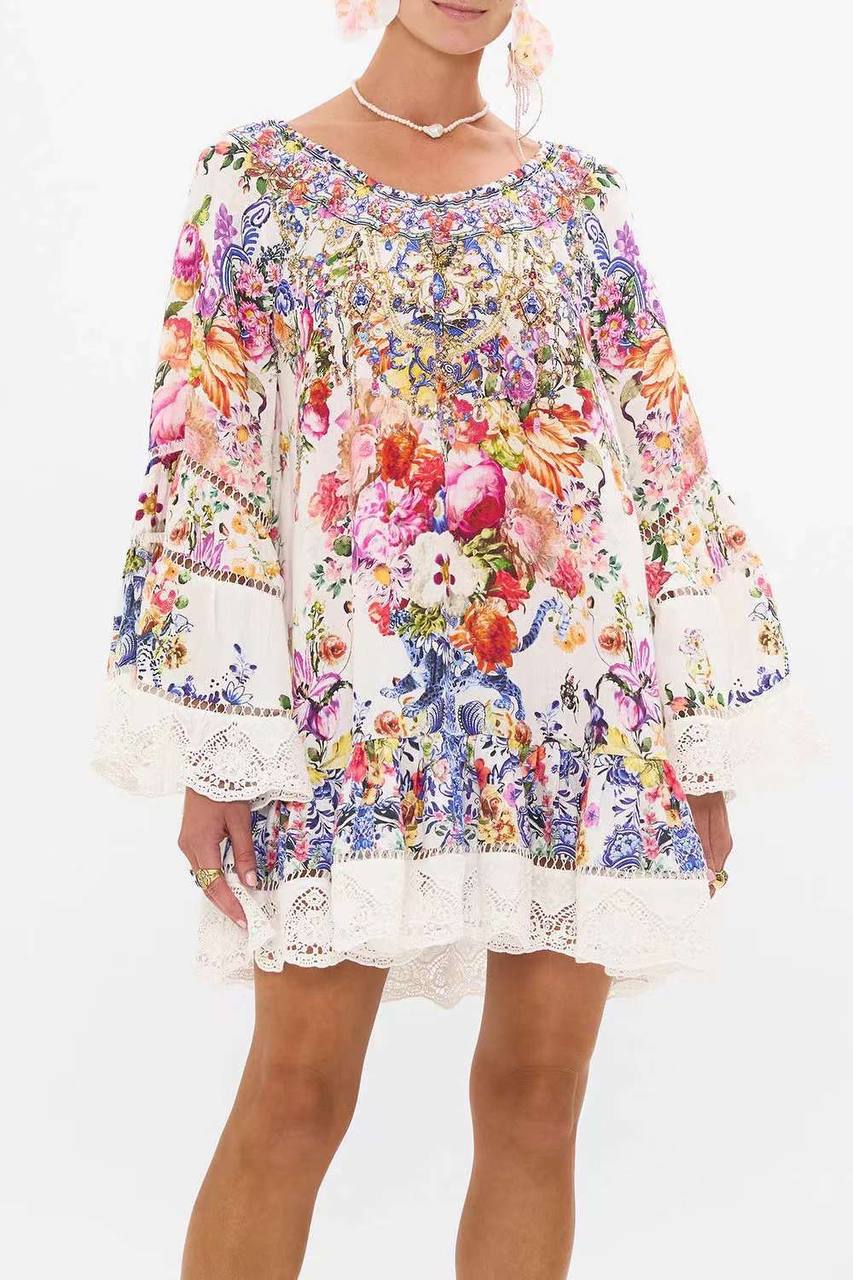 Платье Camilla (артикул LUX-107064) представляет собой воплощение богемного стиля. Платье выполнено в светлых тонах с ярким цветочным принтом. Украшено кружевными вставками по краям рукавов и подолу, что придает ему женственность и легкость.