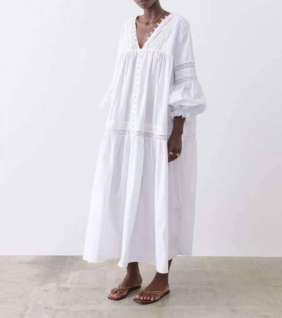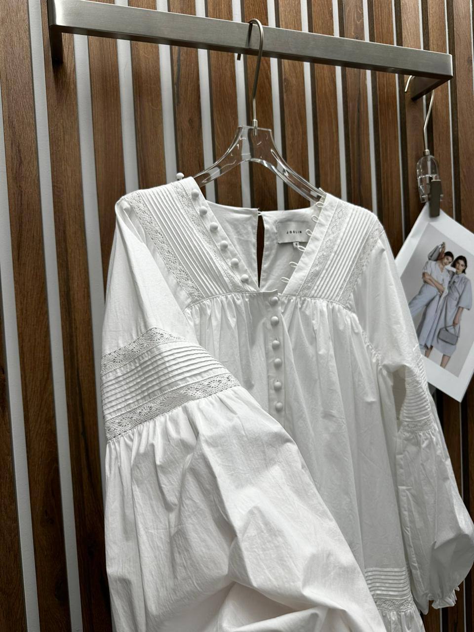 Платье Joslin LUX-104390 - это воздушное платье в стиле бохо, выполненное в белом цвете. Его особенностью является свободный крой, длинные рукава с манжетами и V-образный вырез, который украшен декоративными элементами. Платье предназначено для летнего гардероба, создавая комфортный и стильный образ.