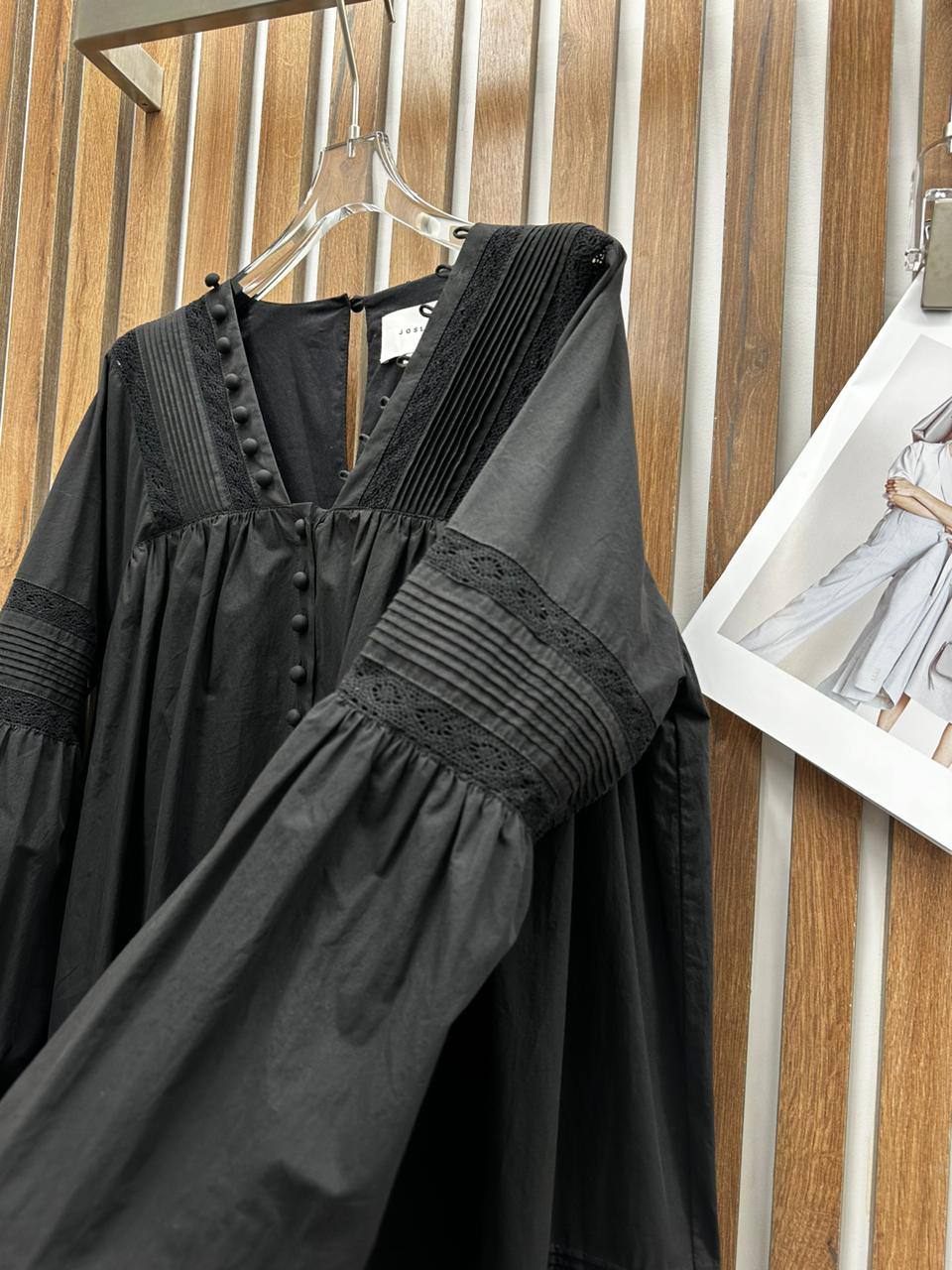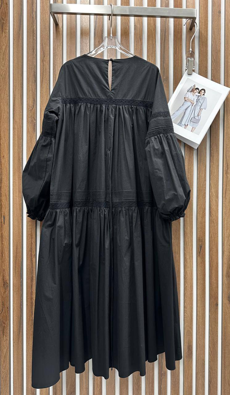 Платье Joslin LUX-104391 представляет собой элегантное платье миди черного цвета. Платье выполнено в свободном стиле, с длинными рукавами с расклешенными манжетами и глубоким V-образным вырезом, подчеркивающим женственность. Ткань имеет мягкую текстуру, придающую платью легкость и воздушность.