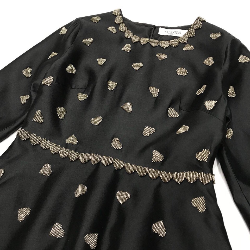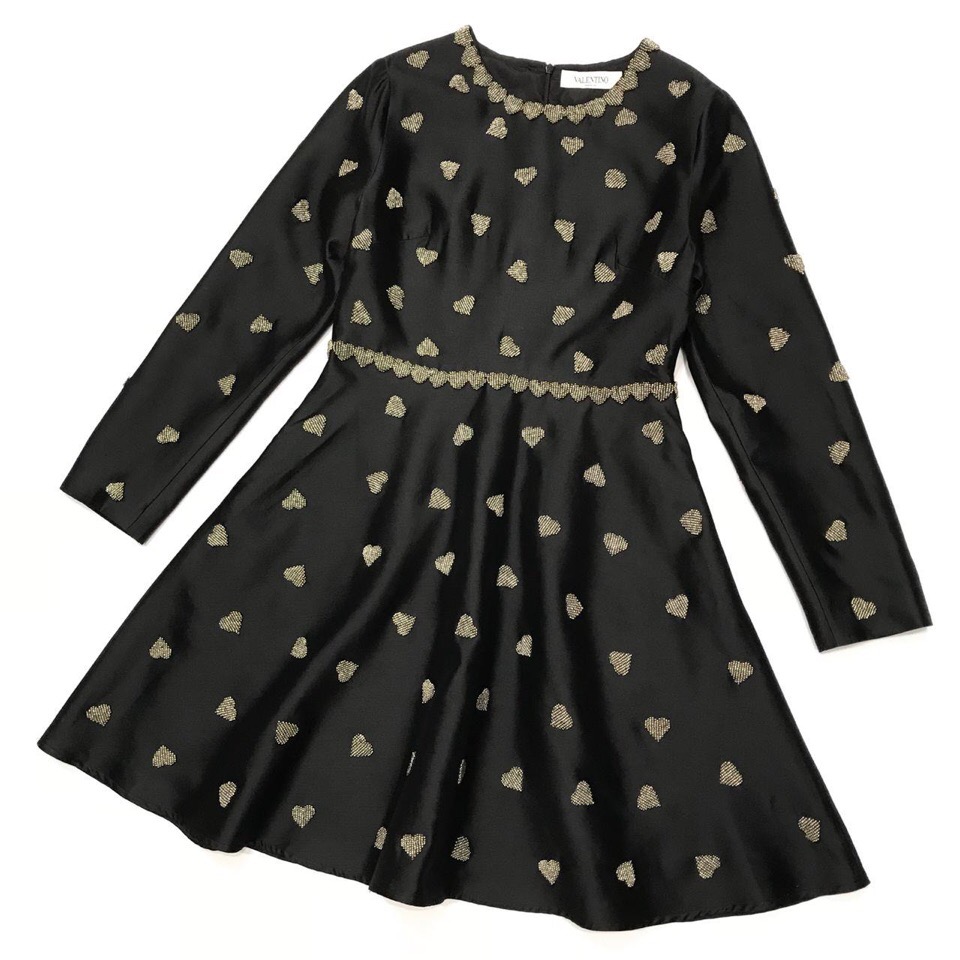 Элегантное черное платье ОДЖ-1062 от Valentino с длинными рукавами и расклешенной юбкой. Модель украшена золотистым принтом в виде сердечек по всей поверхности, а также изящной вышивкой в тон на горловине и по линии талии, что придает изделию особый шарм и изысканность. Это платье идеально подойдет для создания как романтичного, так и более формального образа.