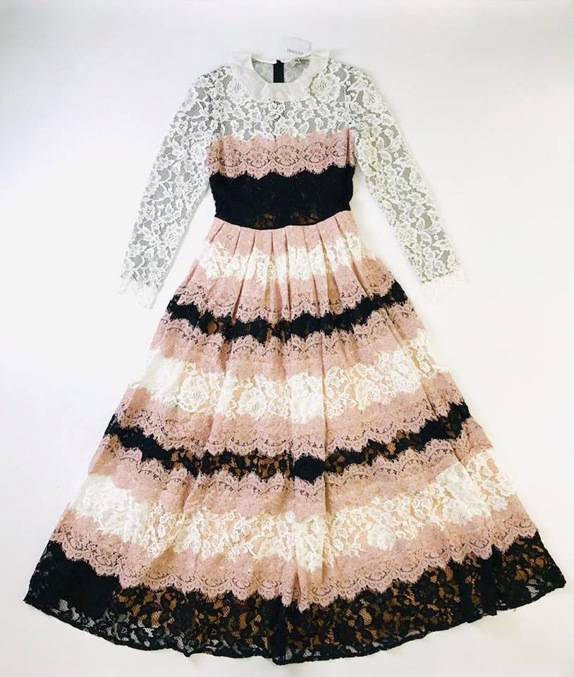 Это элегантное платье ОДЖ-1269 бренда OJ, выполненное в романтичном стиле, идеально подходит для особых случаев. Сочетание нежных кружевных полос в розовых, кремовых и черных оттенках, а также кружевной отделки рукавов и воротника создает женственный и изысканный образ. Силуэт платья подчеркивает фигуру, а многоярусная юбка добавляет легкости и изящества.
