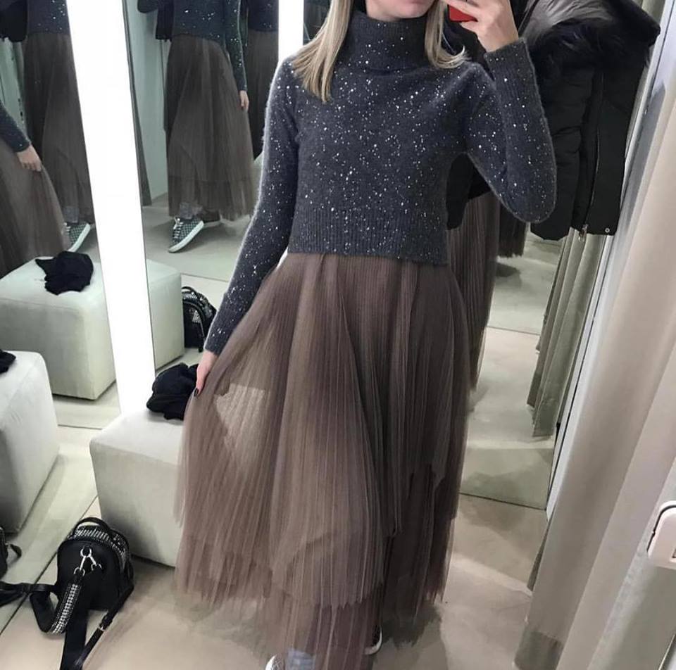 Платье ОДЖ-1321 от luxe-crime — это изысканный образ, сочетающий элегантность и современный стиль. Оно идеально подходит для создания как вечерних, так и более повседневных, но стильных луков. Многослойная юбка из полупрозрачной ткани придает платью воздушность и романтичность, а укороченный свитер с пайетками добавляет образу сияния и изысканности.