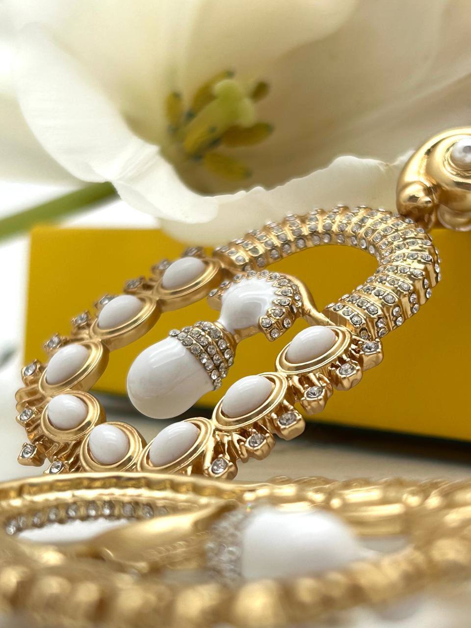 Серьги Schiaparelli (LUX-116594) представляют собой роскошные серьги, выполненные в элегантном стиле. Золотистый оттенок металла в сочетании с белыми элементами и сверкающими кристаллами придают украшению изысканный вид. Они идеально подойдут для добавления акцента в ваш образ.