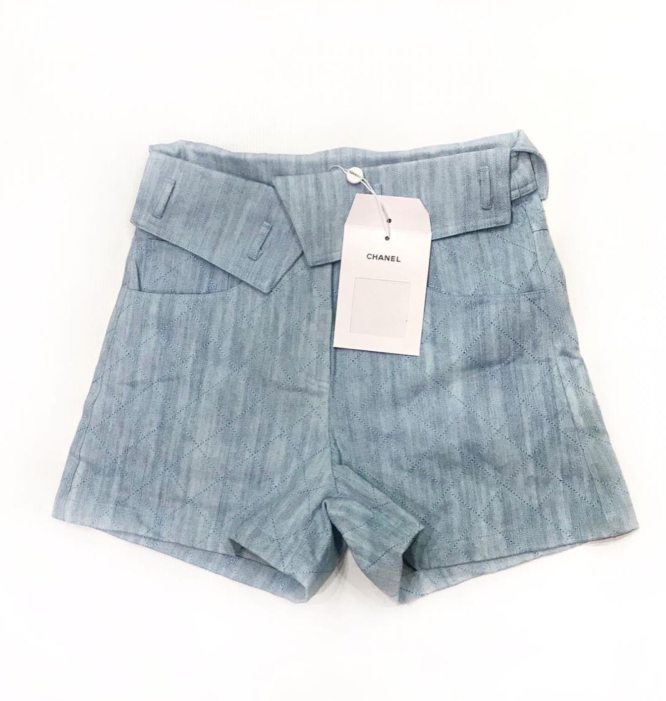 Эти короткие шорты от CHANEL в светло-голубом цвете — воплощение элегантности и комфорта. Модель имеет оригинальный дизайн пояса с декоративными элементами и прострочкой ромбами по всей поверхности, придающей изделию изысканный вид. Классический крой шорт идеально подходит для создания стильных летних образов.