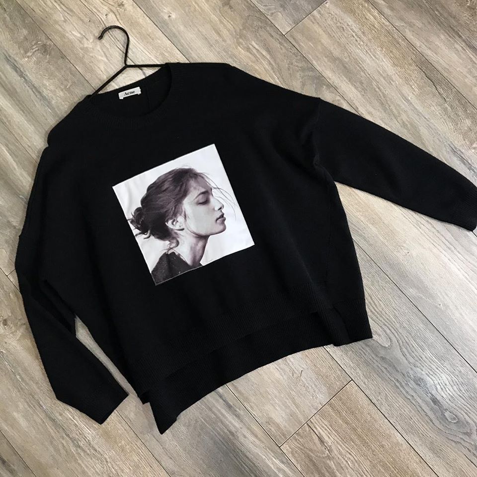 Этот черный джемпер Acne LUX-29730 выполнен в современном стиле и украшен выразительным принтом в виде портрета девушки. Свободный крой и мягкий материал обеспечивают комфорт при носке, делая его идеальным выбором для повседневных образов. Джемпер легко сочетается с различными элементами гардероба, добавляя уникальности любому наряду.