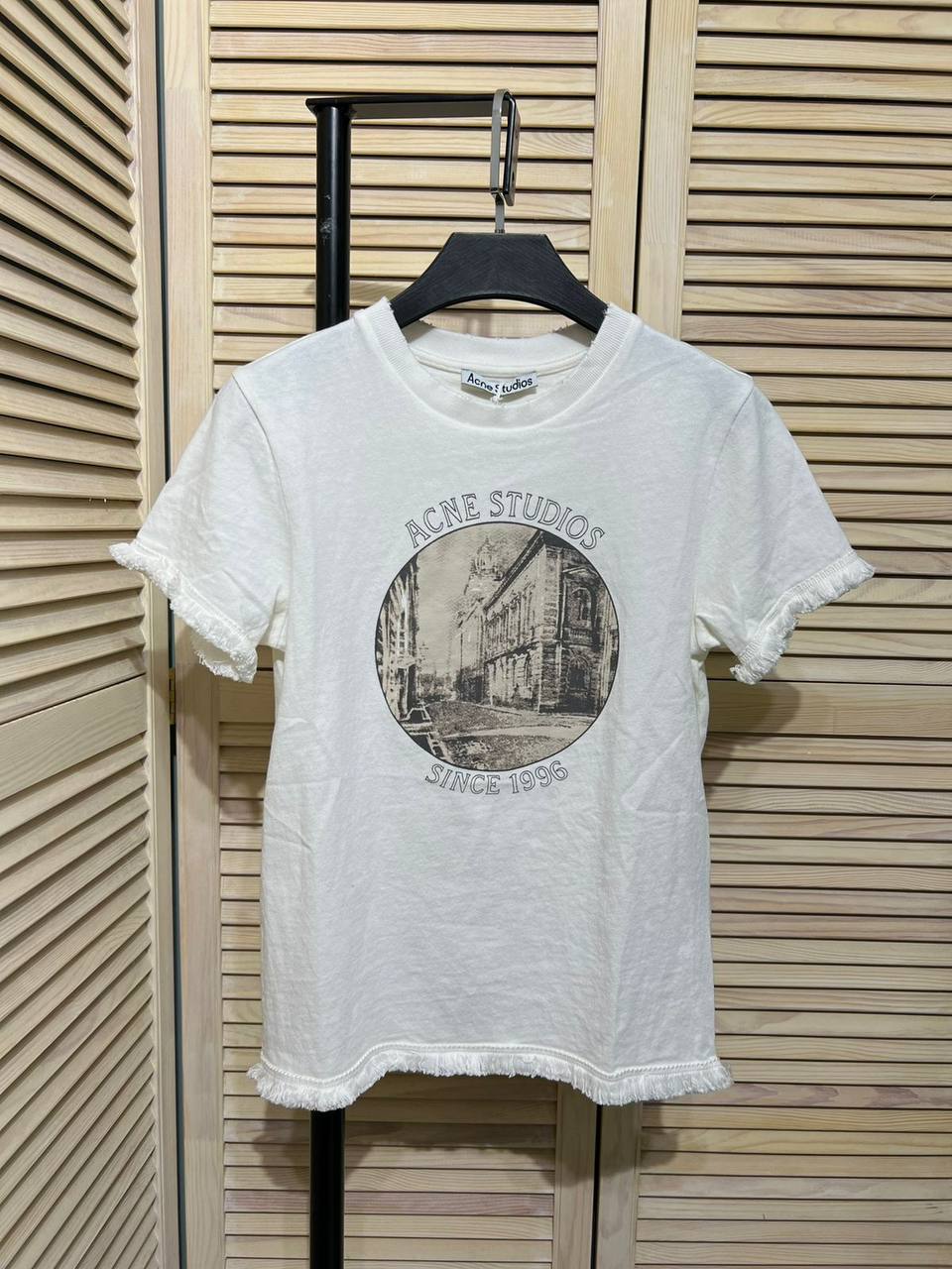 Футболка Acne LUX-89154 — это стильный предмет гардероба от известного бренда. Футболка выполнена в белом цвете с круглым вырезом и короткими рукавами с бахромой. На передней части изделия расположен круглый принт с изображением здания и надписью "ACNE STUDIOS SINCE 1996".