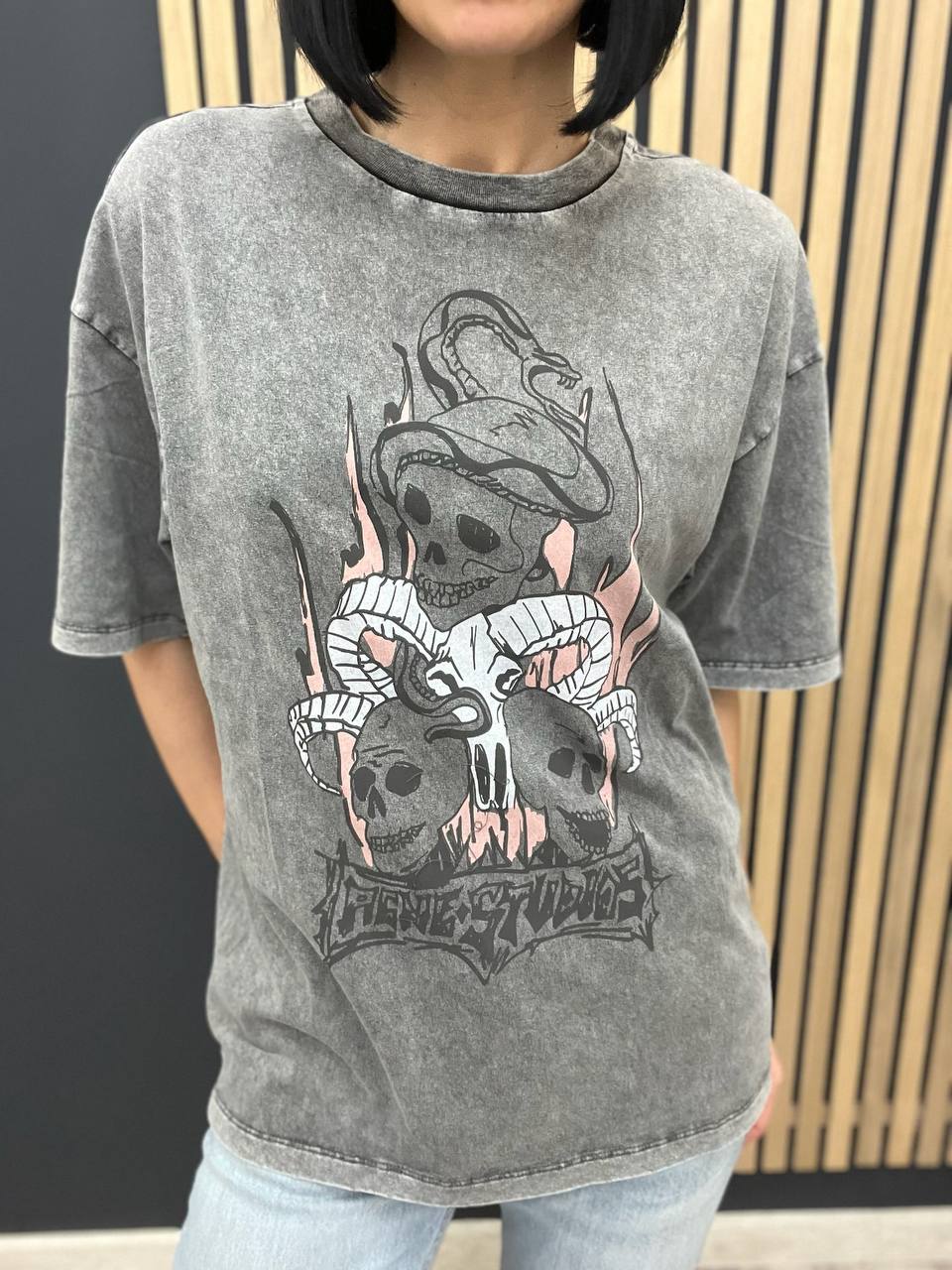 Футболка женская Acne LUX-104718 - это стильная футболка от бренда Acne. Она выполнена в сером цвете с оригинальным принтом в виде черепов, змей и надписей, что придает ей бунтарский и запоминающийся вид. Идеально подойдет для создания повседневных образов.
