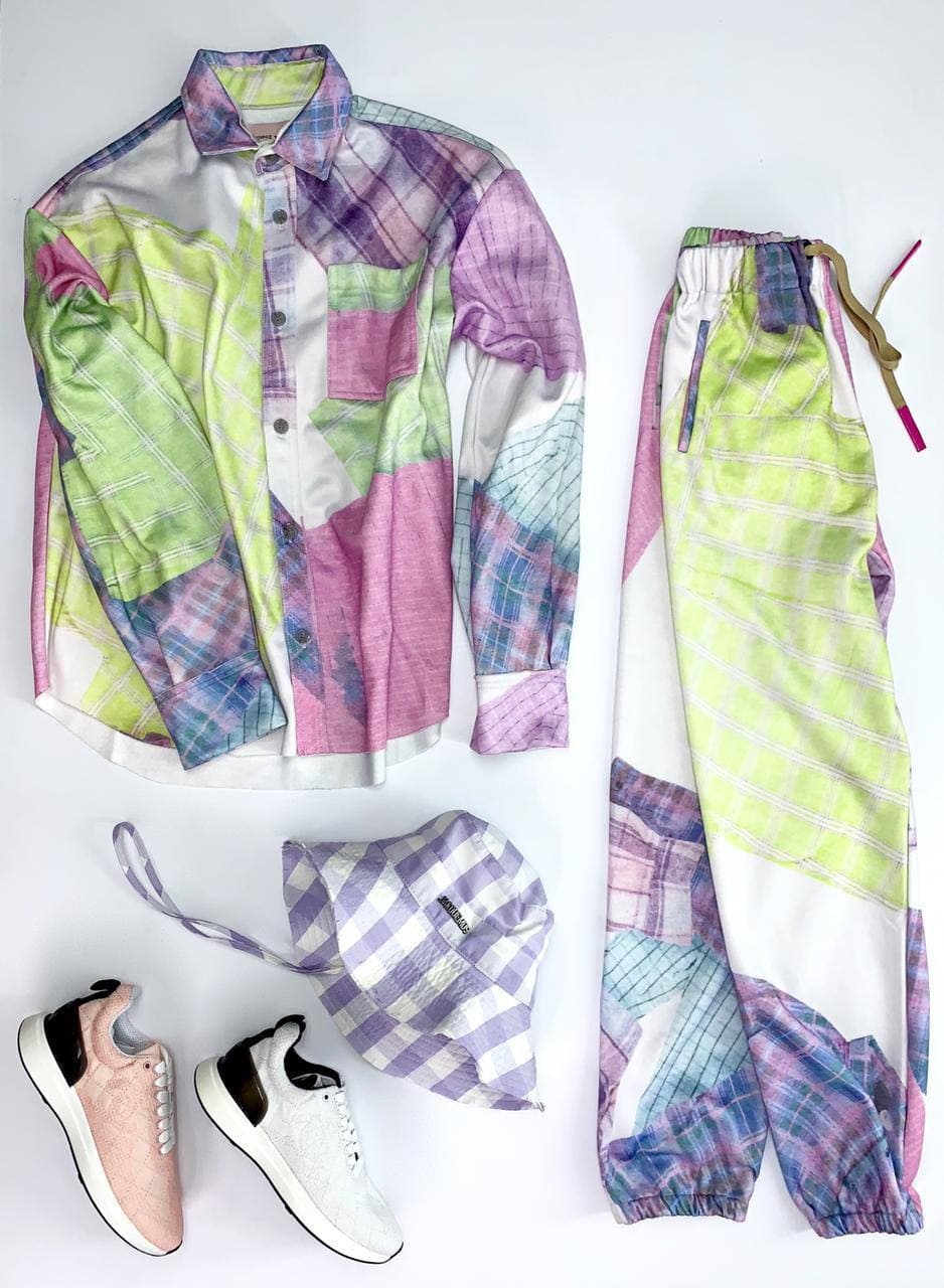 Костюм женский Acne LUX-54024 — это стильный и яркий комплект, состоящий из рубашки и брюк, выполненный в уникальном дизайне с использованием техники пэчворк. Оригинальная расцветка с сочетанием пастельных оттенков розового, зеленого и фиолетового создает эффектный внешний вид, подходящий для создания модных образов. Костюм Acne идеально подходит для повседневного ношения, прогулок и встреч с друзьями, подчеркивая индивидуальность своей обладательницы.