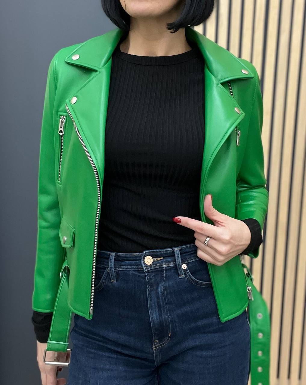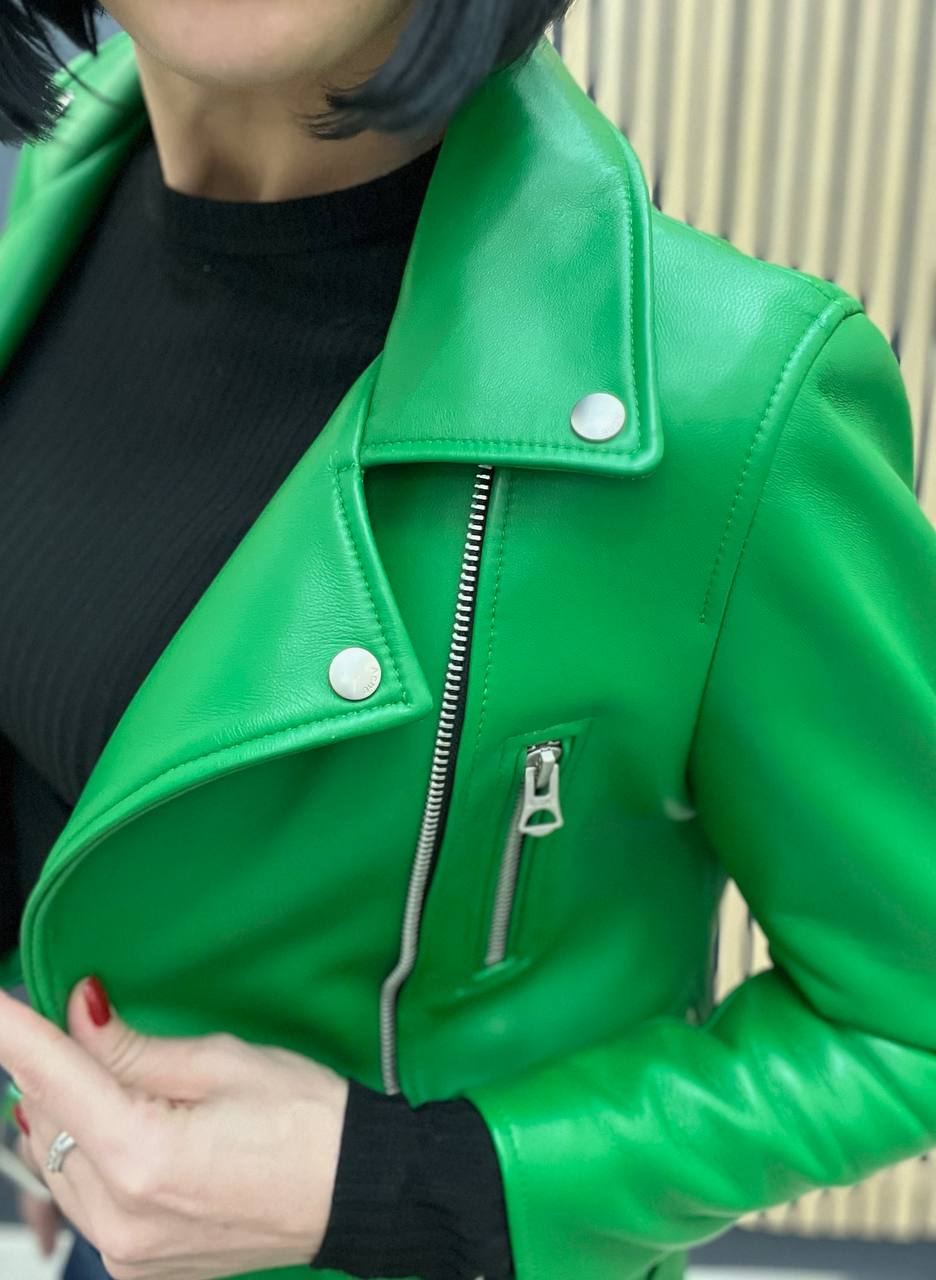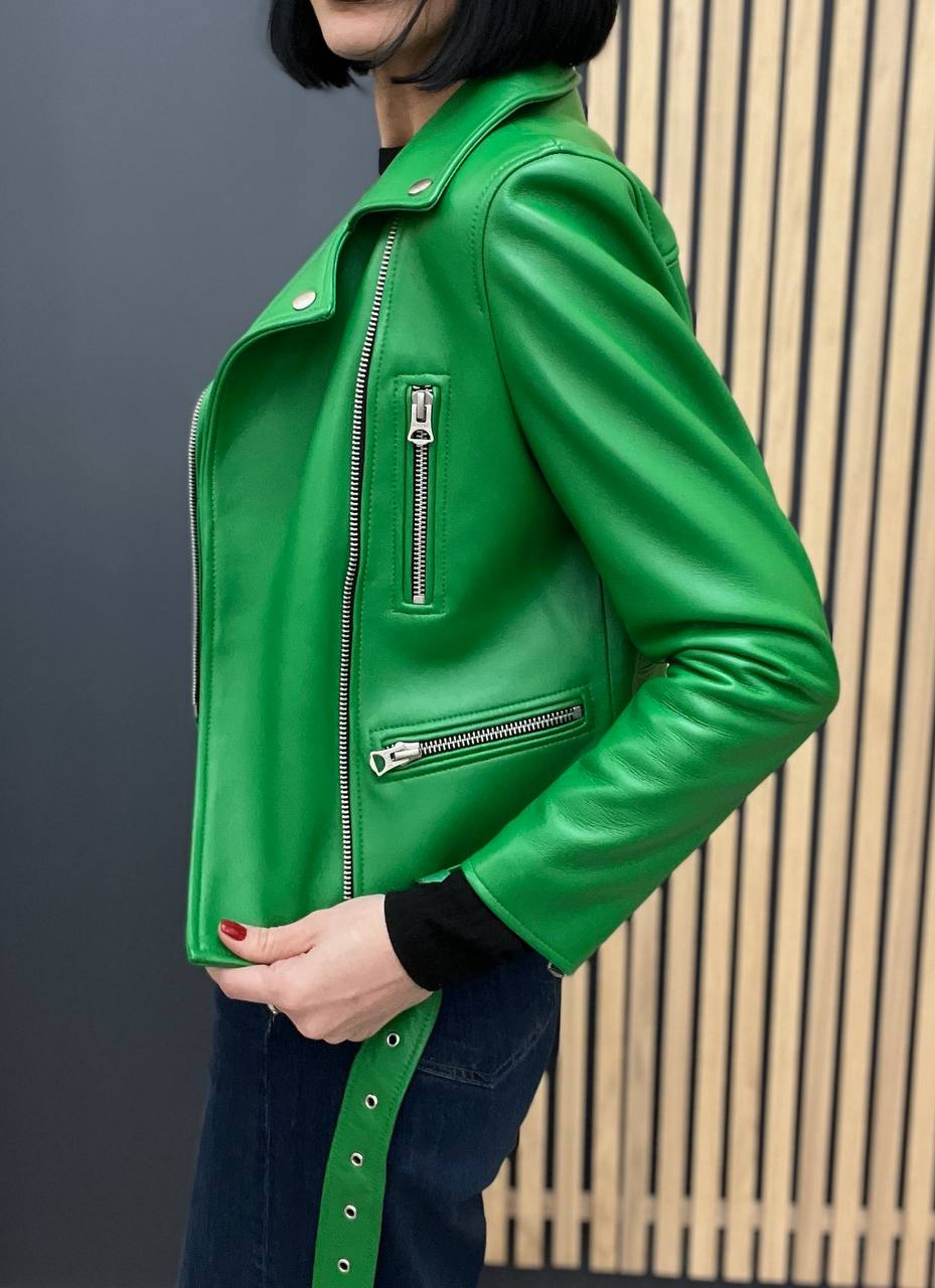 Кожаная куртка Acne LUX-103200 — это стильная модель в мотоциклетном стиле, выполненная в ярком зеленом цвете. Куртка имеет гладкую текстуру, асимметричную молнию, накладные карманы и пояс с пряжкой. Отлично подойдет для создания ярких и запоминающихся образов.