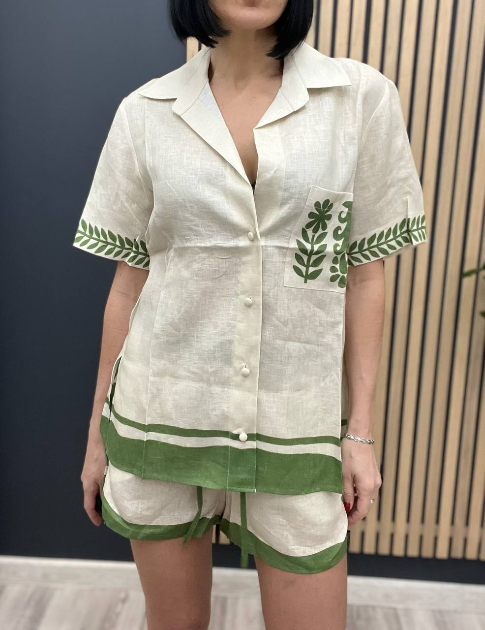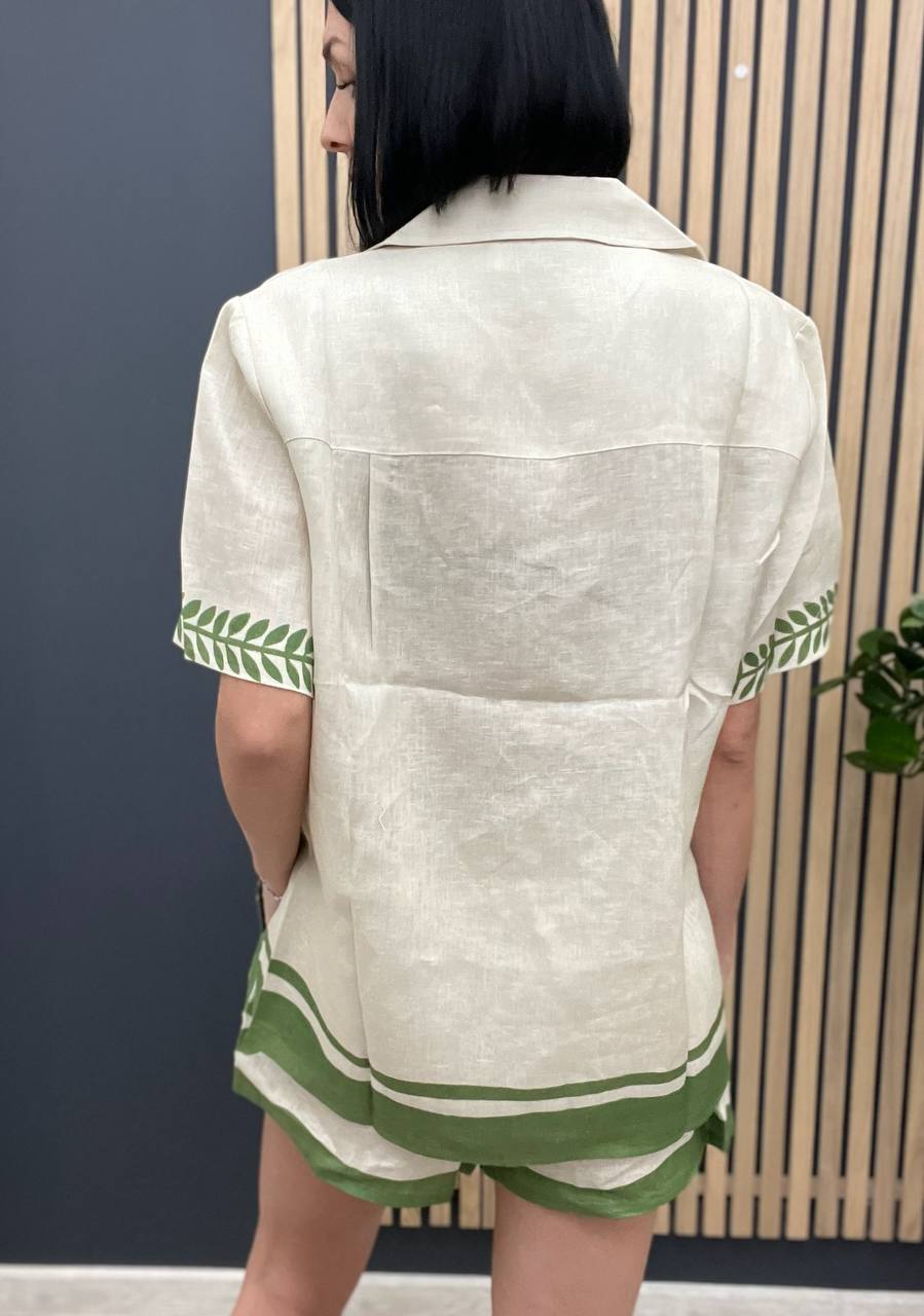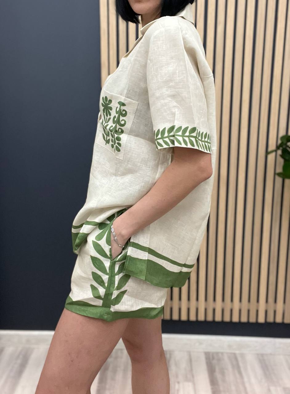 Костюм Alemais LUX-103492 – это стильный летний комплект, состоящий из рубашки с короткими рукавами и шорт. Бежевый костюм украшен зелеными элементами – полосами по краям и цветочным орнаментом на кармане и рукавах. Этот комплект идеально подойдет для создания расслабленных летних образов.