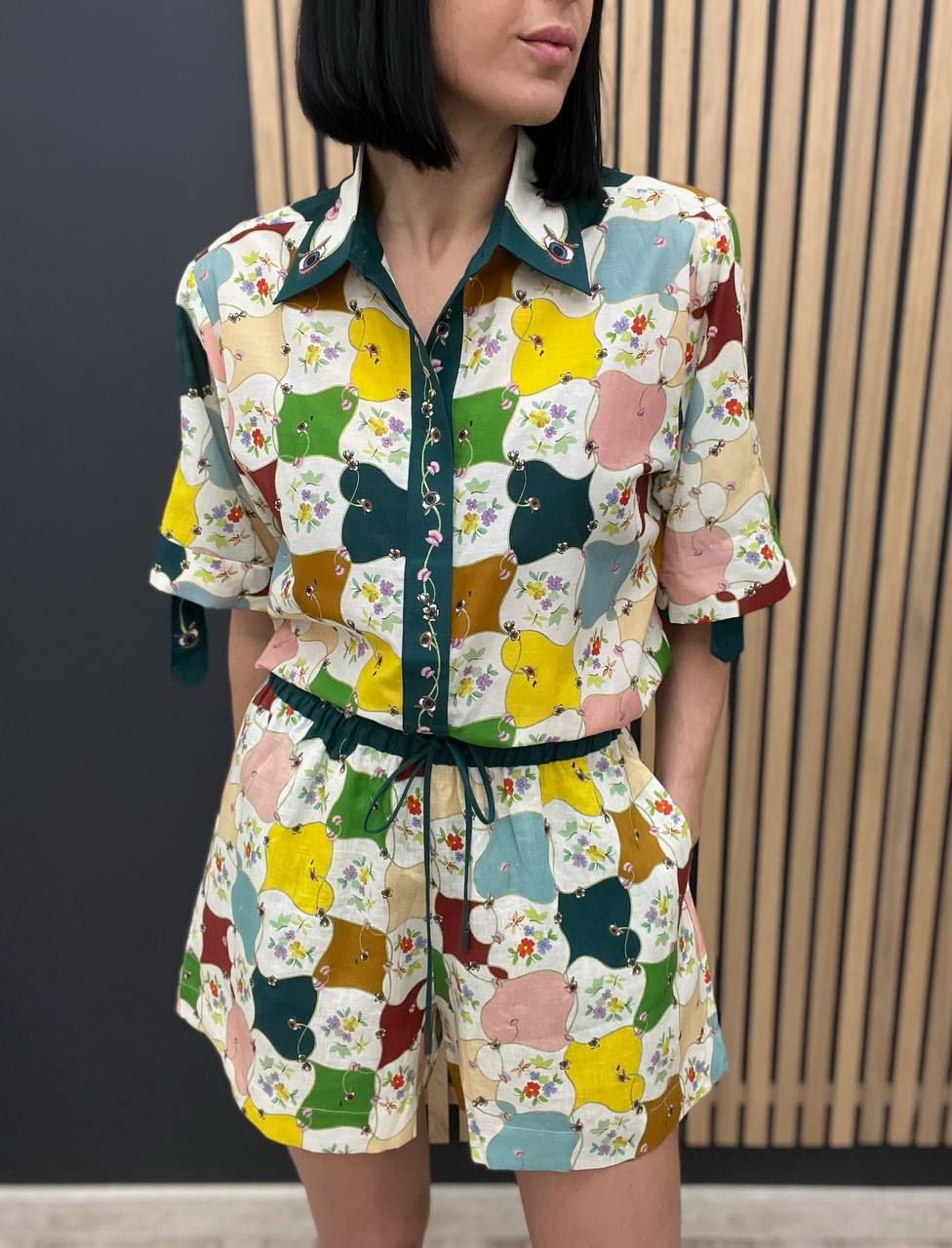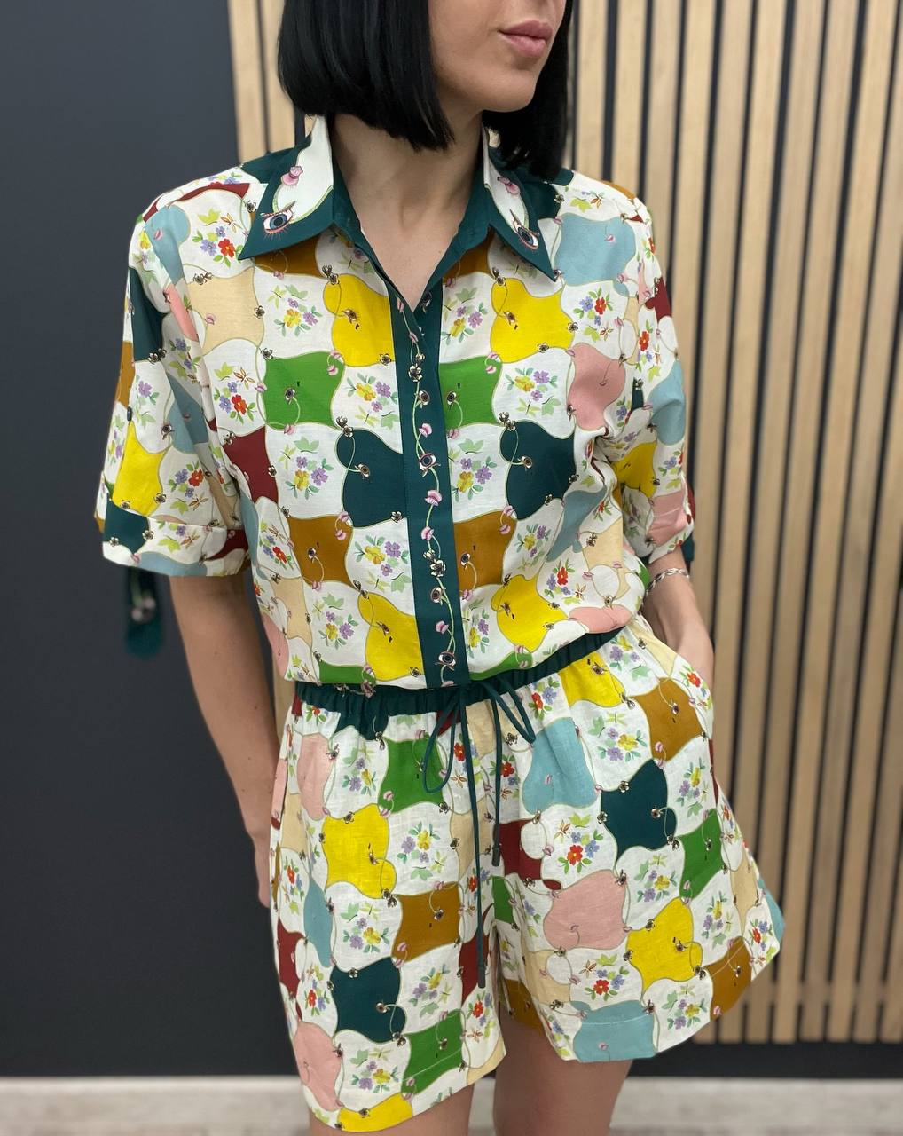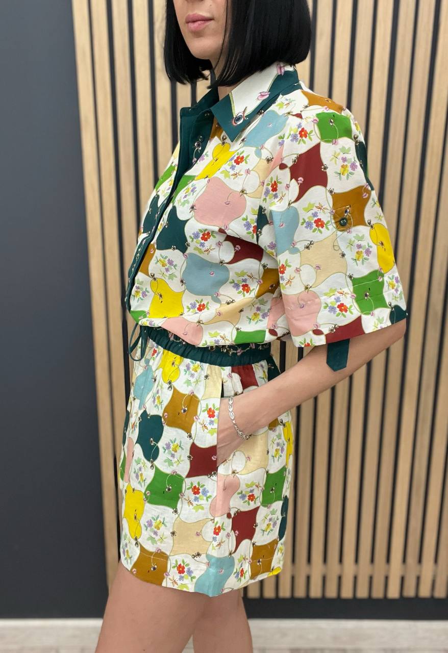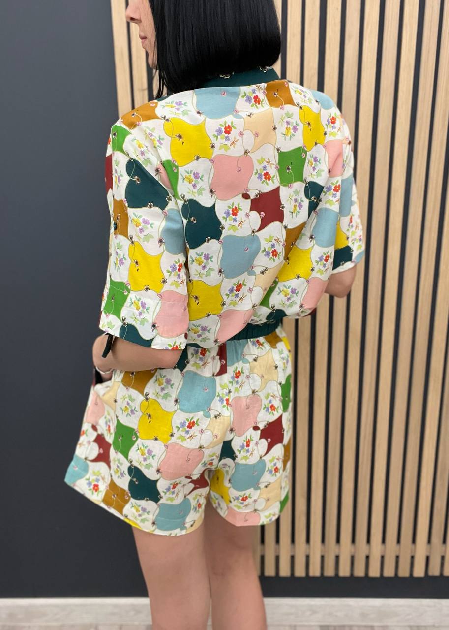 Костюм женский Alemais LUX-104580 представляет собой стильный комплект, состоящий из рубашки с коротким рукавом и шорт. Комплект выполнен в ярком, привлекающем внимание дизайне, с использованием разноцветного принта. Этот наряд идеально подходит для создания летних, легких образов.