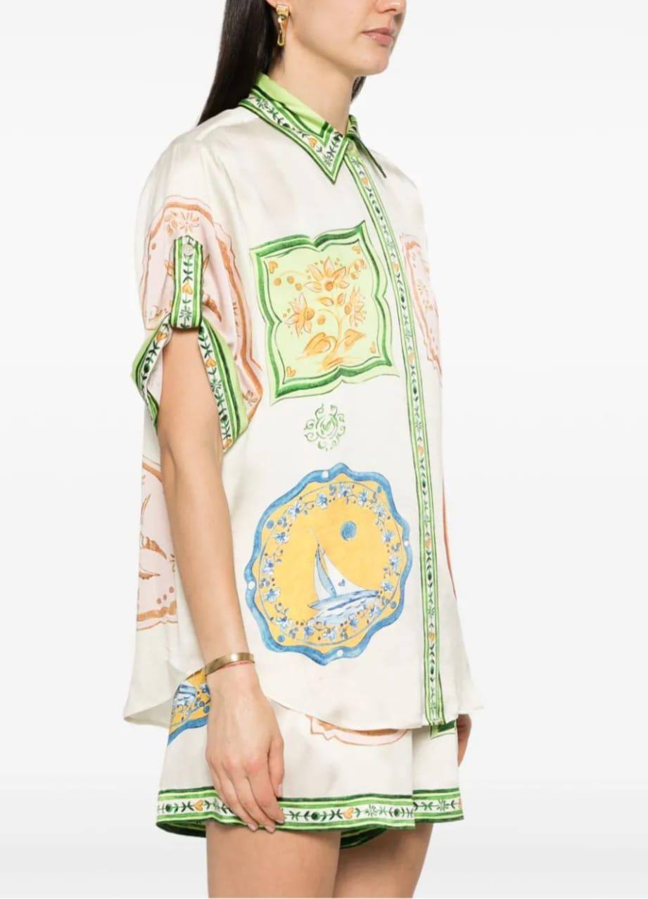 Костюм женский Alemais LUX-105870 представляет собой комплект, состоящий из рубашки с короткими рукавами и шорт. Комплект выполнен в светлых тонах с красочным узором. Этот костюм, подойдет для создания стильного и яркого образа в теплые дни.