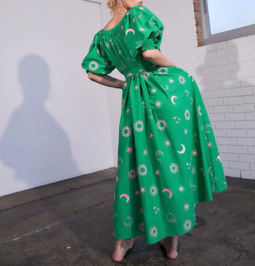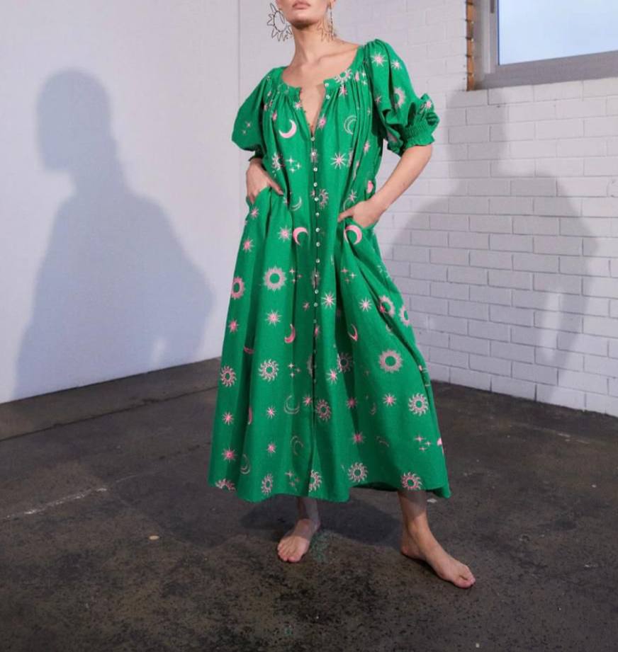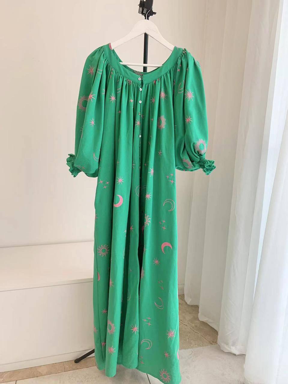 Платье Alemais LUX-108394 представляет собой яркий и стильный предмет гардероба. Зеленое платье с розовым принтом в виде солнца, луны и звезд, имеет свободный крой и рукава-фонарики. Идеально подойдет для создания эффектного образа на каждый день или для особых случаев.