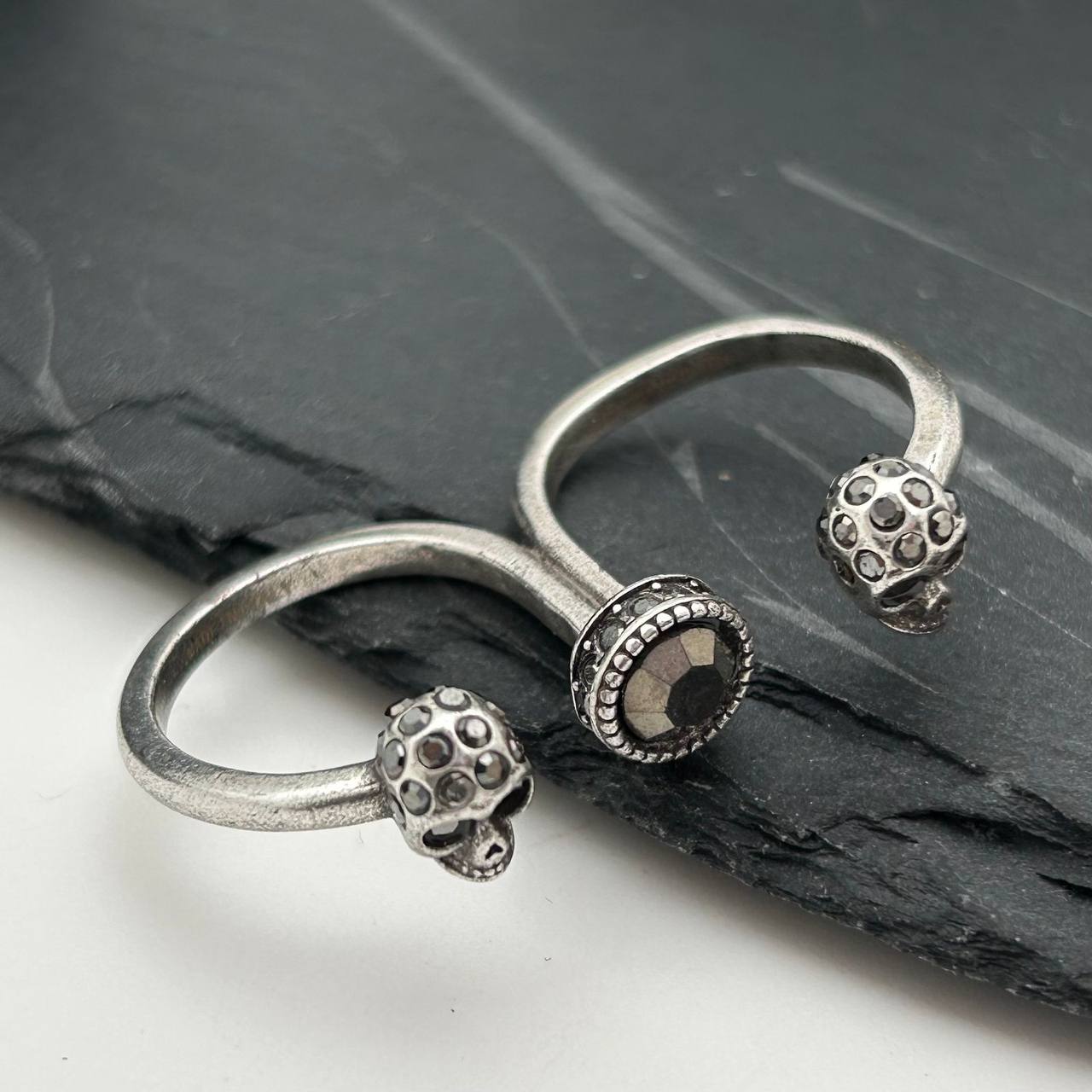 Кольцо Alexander McQueen LUX-110615 выполнено в узнаваемом готическом стиле бренда. Кольцо выполнено в серебристом цвете, имеет форму, охватывающую два пальца. Украшение в виде черепов с инкрустированными камнями придает изделию выразительность и загадочность.
