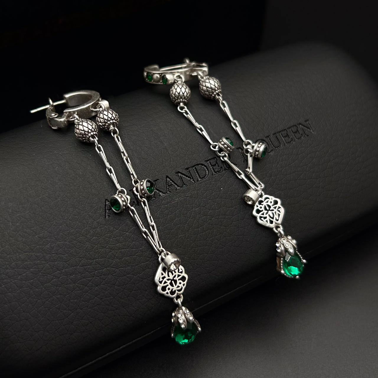 Серьги Alexander McQueen LUX-101254 представляют собой изысканное украшение в серебристом оттенке. Серьги выполнены в подвесном стиле, украшены подвесками и декоративными элементами с кристаллами изумрудного цвета. Идеально подойдут для создания элегантного образа.
