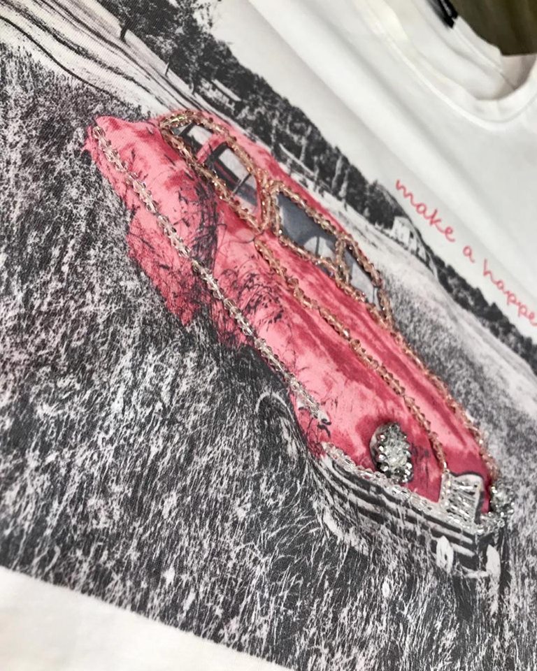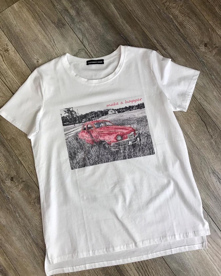 Футболка женская Alexander Wang LUX-14585 — это стильное и комфортное решение для повседневного гардероба. Модель выполнена в классическом белом цвете с оригинальным принтом, изображающим винтажный красный автомобиль на фоне летнего пейзажа и надписью "make a hopper". Футболка прекрасно подойдет для создания расслабленных, но при этом модных образов, подчеркивая индивидуальность.