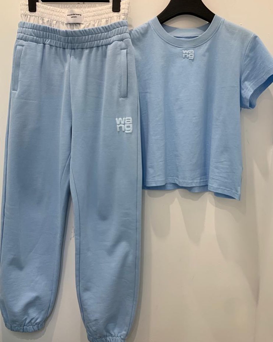 Стильный костюм Alexander Wang LUX-46210, состоящий из футболки и брюк, выполнен в современном спортивном стиле. Комплект отличается лаконичным дизайном и комфортом, что делает его идеальным для повседневного образа. Нежный голубой цвет и минималистичный логотип бренда придают изделию элегантность.