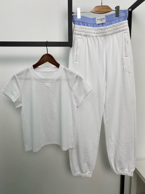 Представленный костюм Alexander Wang LUX-55710 — это стильный и комфортный выбор в белом цвете. Комплект состоит из футболки с коротким рукавом и брюк-джоггеров, выполненных в лаконичном дизайне. Декоративный элемент в виде объемных букв "AW" на футболке и брюках добавляет брендовый акцент. Этот костюм идеально подходит для создания расслабленных, но элегантных повседневных образов, а также может быть частью спортивного гардероба.