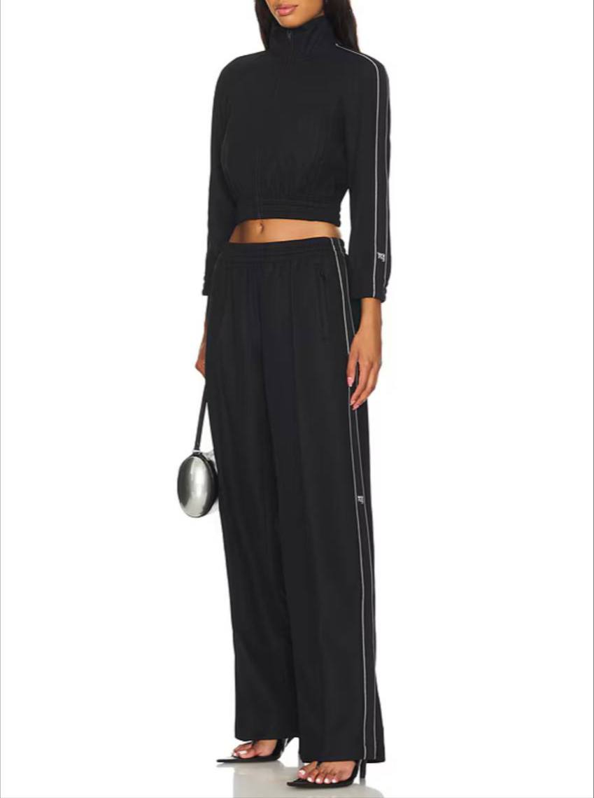 Спортивный костюм Alexander Wang LUX-109681 представляет собой стильный комплект, сочетающий в себе спортивный шик и современный дизайн. Костюм выполнен в черном цвете с белыми полосками по бокам брюк и рукавам. Это идеальный выбор для создания как повседневных, так и более элегантных образов.