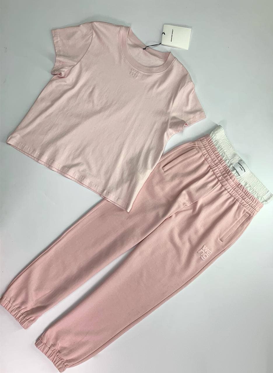 Спортивный костюм Alexander Wang LUX-54101 — это воплощение современного минимализма и комфорта. Комплект, состоящий из футболки и брюк, выполнен в нежном розовом оттенке, что придает ему особую мягкость и женственность. Логотип бренда ненавязчиво акцентирует внимание на эксклюзивности изделия, делая его идеальным выбором для создания стильных повседневных образов. Этот костюм подойдет для прогулок, занятий спортом или просто для домашнего уюта.