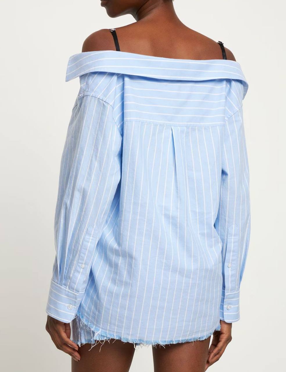 Костюм женский Alexander Wang LUX-87501 – это стильный летний комплект, состоящий из рубашки и шорт. Дизайн костюма выполнен в классическом стиле с акцентом на непринужденность и комфорт. Голубой цвет с белыми полосками придает образу свежесть и легкость.