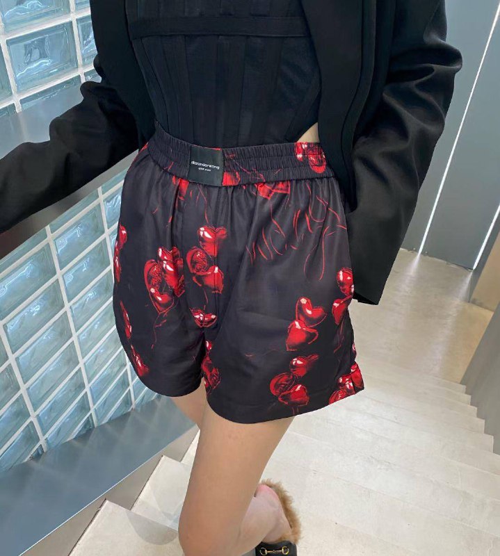 Эти шорты Alexander Wang LUX-51237 — яркий пример современного стритстайл-дизайна, сочетающего смелый принт с элегантным кроем. Модель выполнена в черном цвете с эффектным принтом из красных сердец, что придает ей игривый и запоминающийся вид. Благодаря эластичному поясу, шорты обеспечивают максимальный комфорт и удобство в носке, идеально подходят для создания трендовых образов.