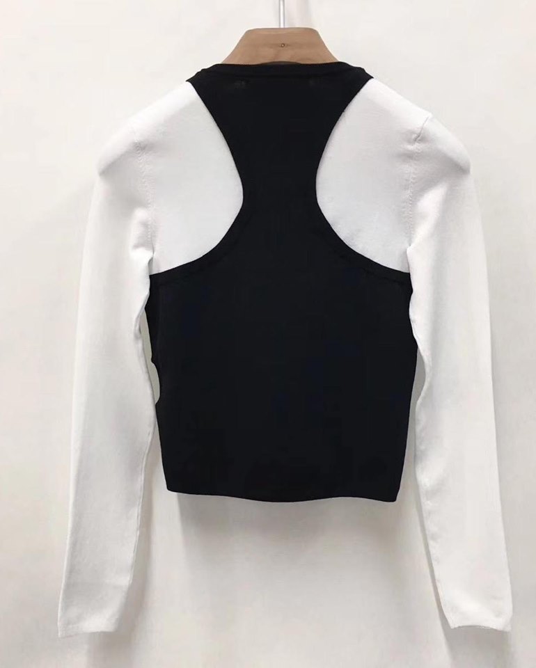 Свитер женский Alexander Wang LUX-19068 — это стильный и современный элемент гардероба, сочетающий в себе контрастные цвета и фирменный логотип бренда. Его дизайн отличается двумя слоями: внутренний черный топ с принтом "wang" и наружный белый лонгслив. Эта модель идеально подходит для создания эффектных и трендовых образов.