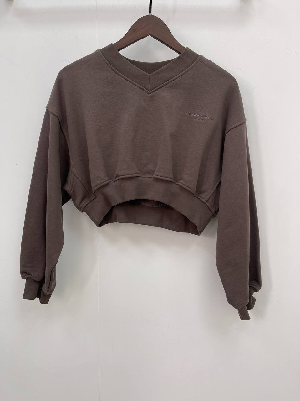 Свитшот Alexander Wang LUX-74480 представляет собой стильный укороченный свитшот темно-коричневого цвета. Он выполнен в современном стиле с V-образным вырезом и надписью бренда. Этот свитшот подойдет для создания модных и комфортных образов.
