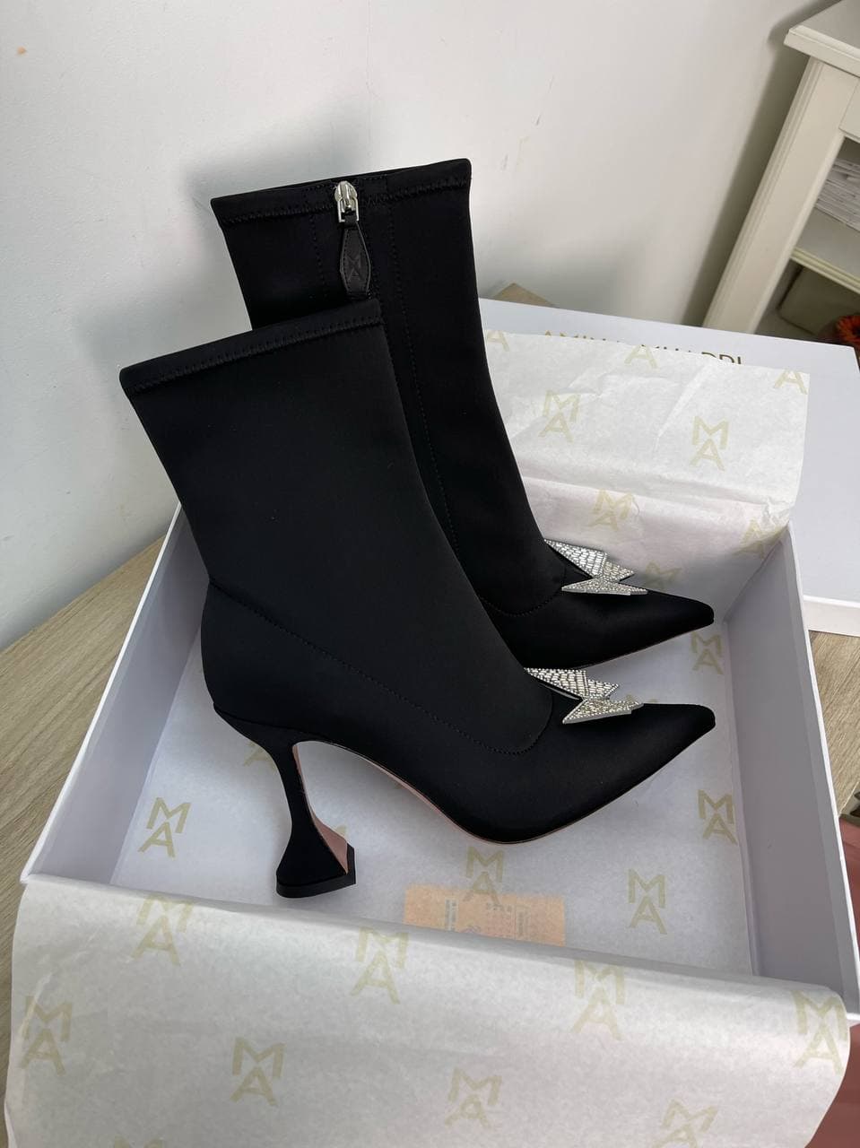 Ботильоны Amina Muaddi LUX-59381 — это элегантная и эффектная модель, сочетающая в себе смелый дизайн и изысканные детали. Остроносая форма и фигурный каблук придают обуви современный и утонченный вид. Декор в виде сверкающих кристаллов в форме молнии на мыске добавляет ботильонам роскоши и индивидуальности, делая их ярким акцентом любого образа.