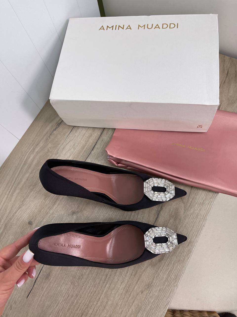 На сайте указан международный (INT) и европейский (EU) размеры одежды бренда Amina Muaddi.