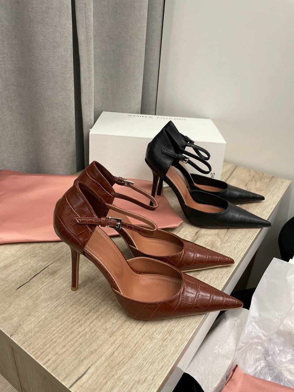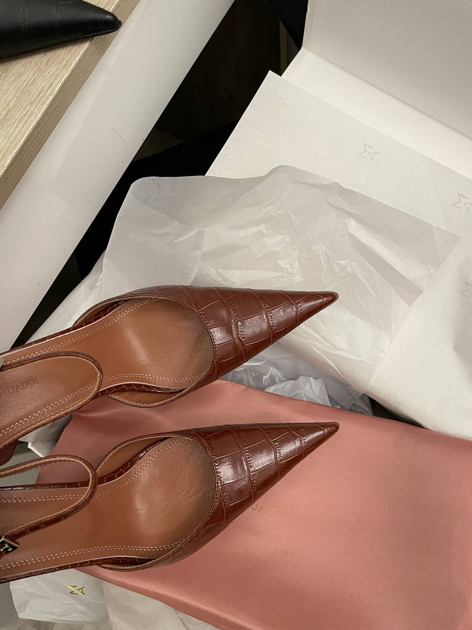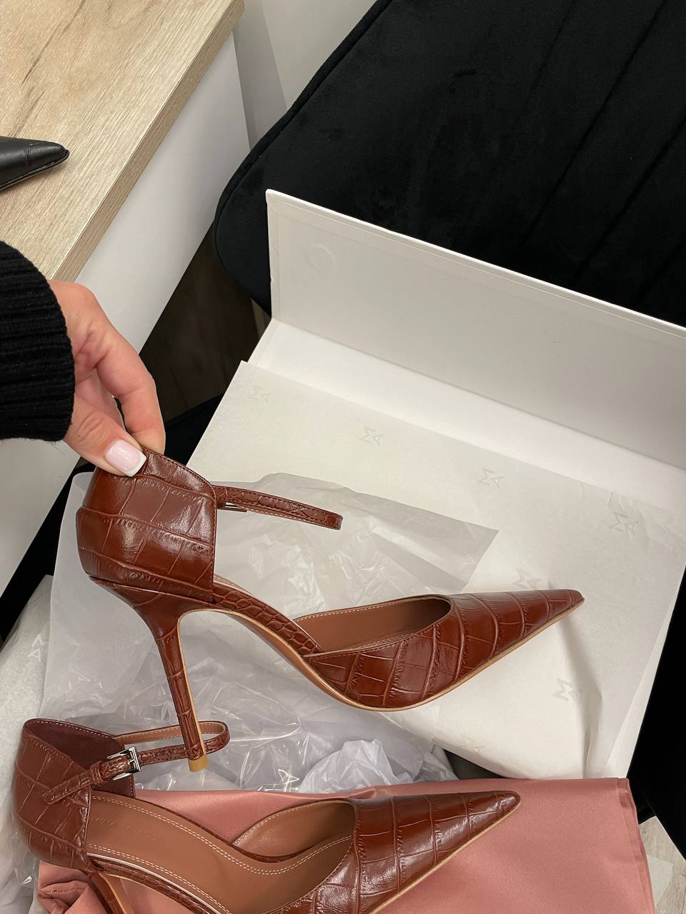 Туфли Amina Muaddi LUX-114861 — это элегантные туфли на высоком каблуке, выполненные в классическом стиле. Они имеют заостренный носок и ремешок на щиколотке. Коричневый цвет и текстура под кожу крокодила придают обуви изысканный вид, делая их подходящими как для вечерних выходов, так и для повседневной носки.