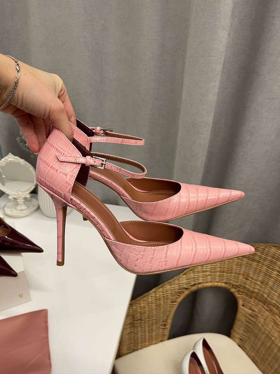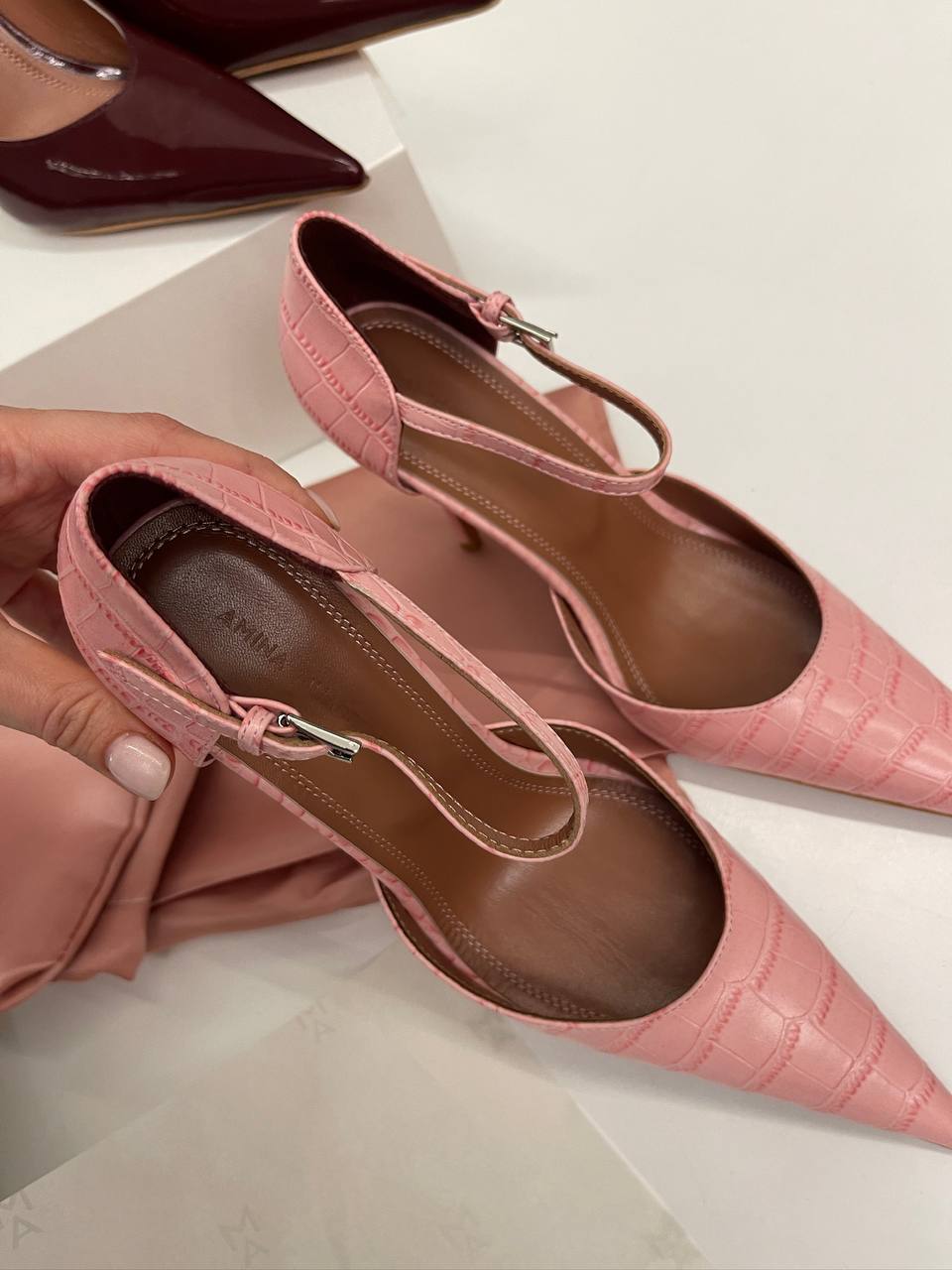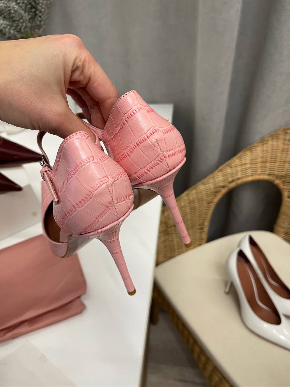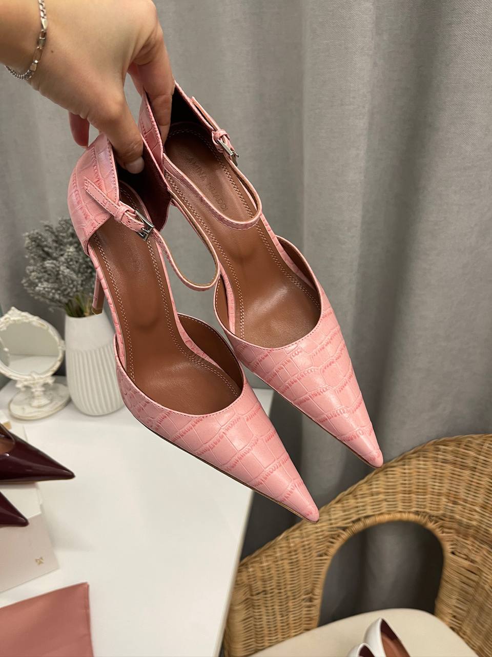 Туфли Amina Muaddi LUX-114862 — элегантные туфли на высоком каблуке, выполненные в нежно-розовом цвете с текстурой под кожу крокодила. Обувь отличается заостренным мысом и тонкими ремешками на щиколотке, создавая изысканный и женственный образ. Идеально подойдут для вечерних выходов или торжественных мероприятий.