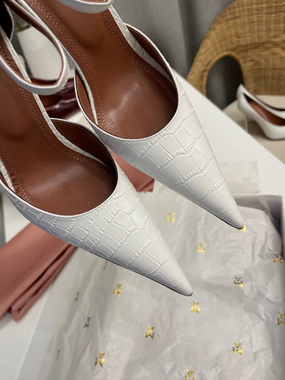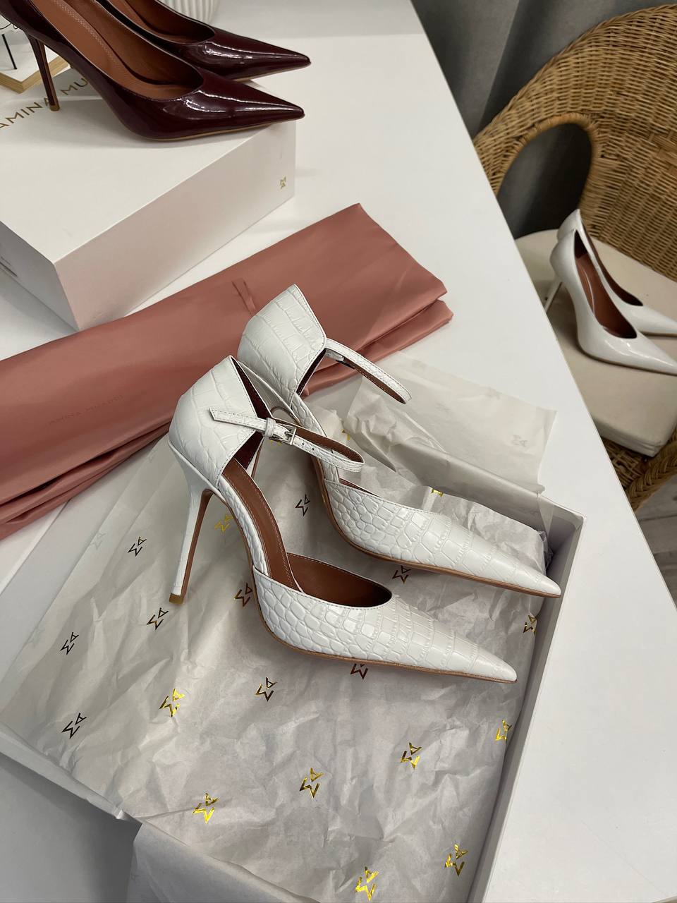 Туфли Amina Muaddi LUX-114863 – это стильная и элегантная обувь, которая сочетает в себе современный дизайн и утонченность. Белый цвет и текстура под крокодиловую кожу придают им изысканный вид. Эти туфли идеально подойдут для создания ярких образов, подчеркивая индивидуальность своей обладательницы.