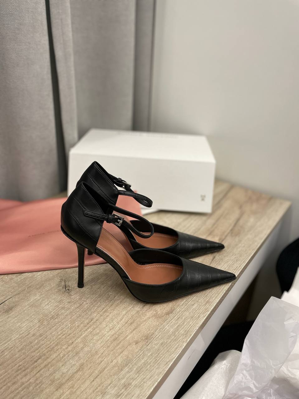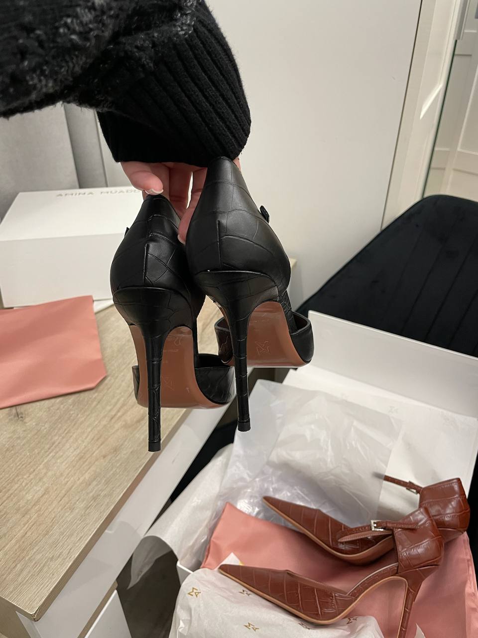 Туфли Amina Muaddi LUX-114864 – это элегантные туфли на высоком каблуке. Чёрный цвет, текстурированная отделка и классический силуэт делают их подходящими для различных образов, от повседневных до вечерних.