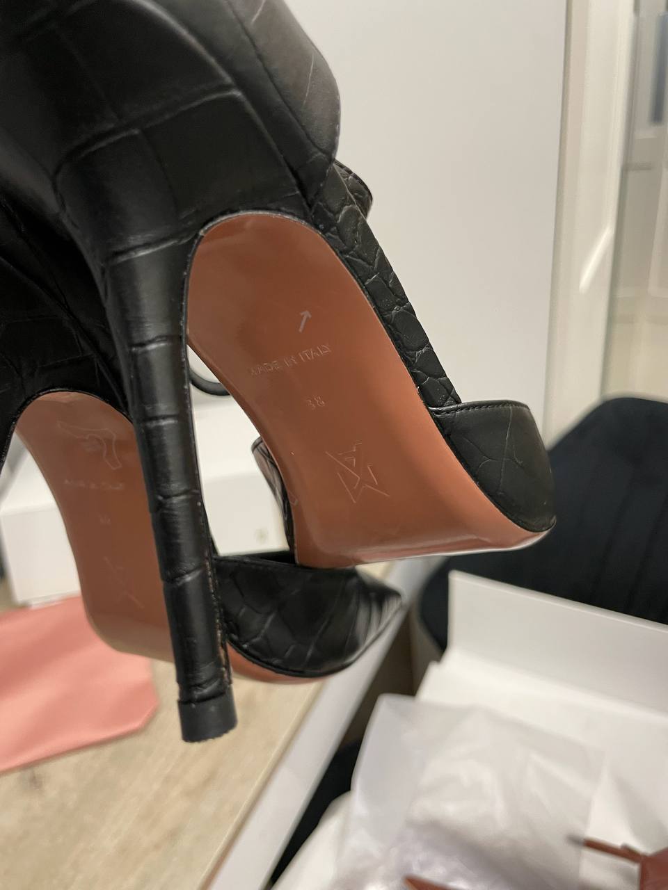 На сайте указан международный (INT) и европейский (EU) размеры одежды бренда Amina Muaddi.