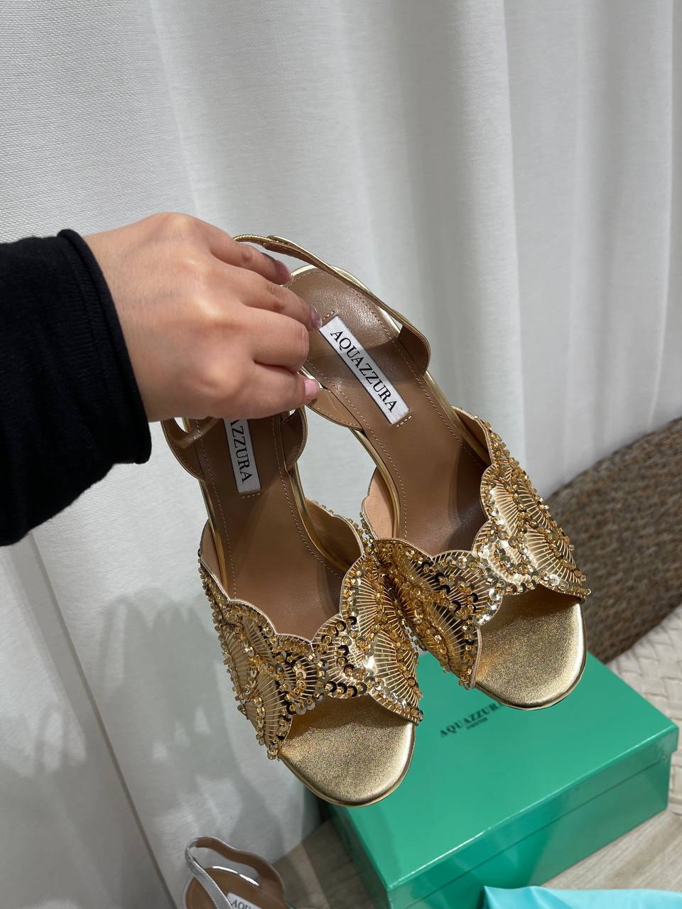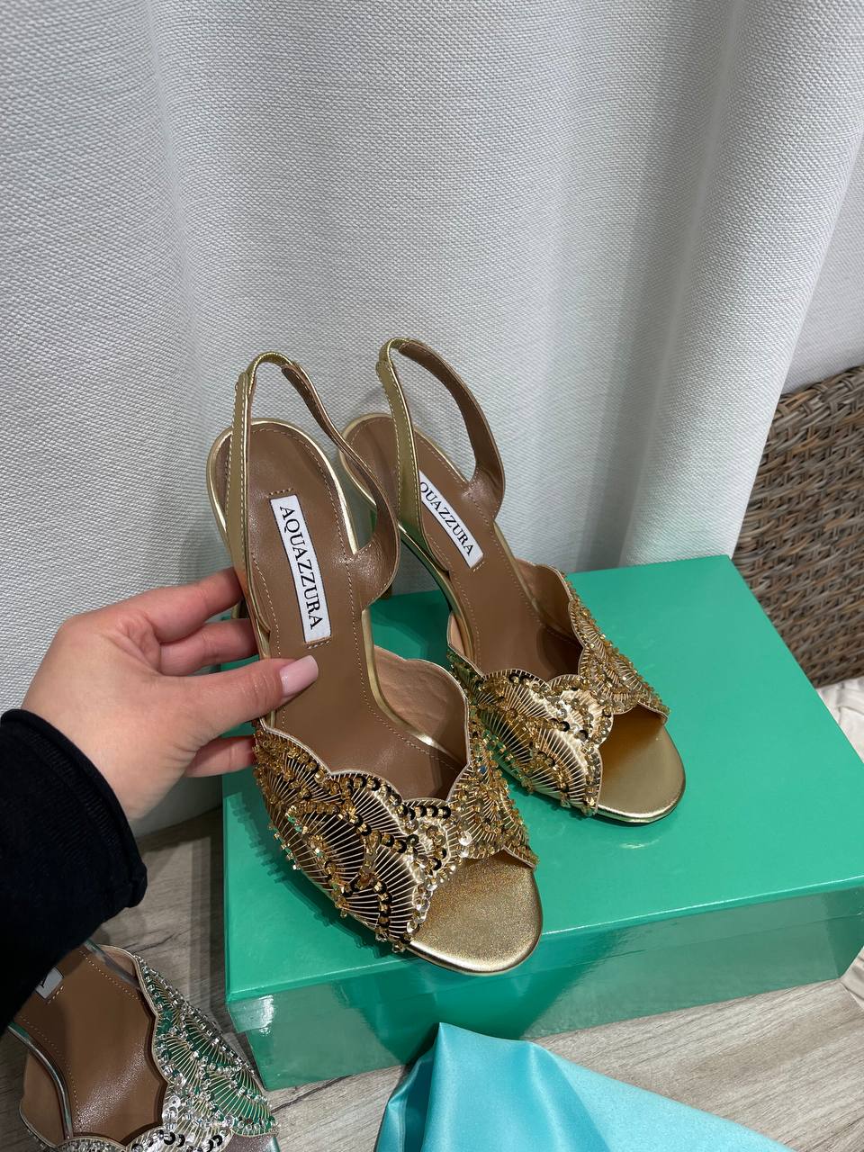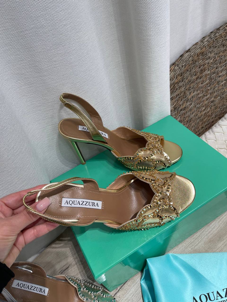 Босоножки Aquazzura Firenze – это элегантная и стильная обувь, которая подчеркнет ваш изысканный вкус. Золотистые босоножки на высоком каблуке, декорированные мерцающими элементами, станут прекрасным дополнением к вечернему наряду.
