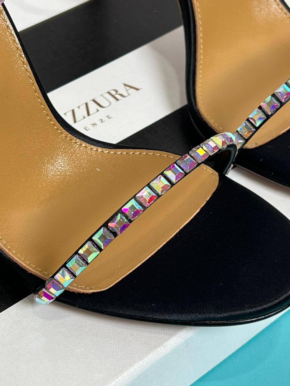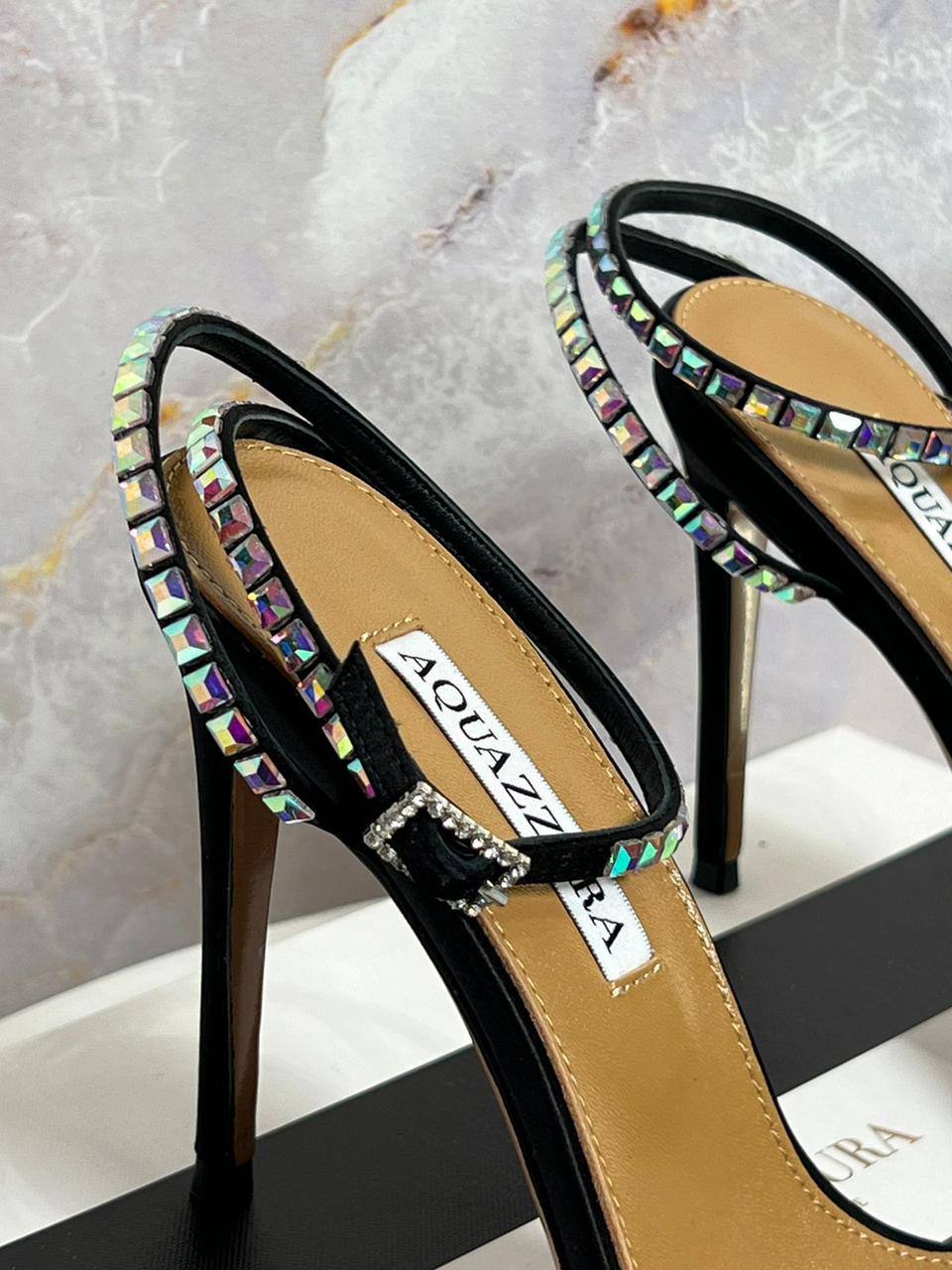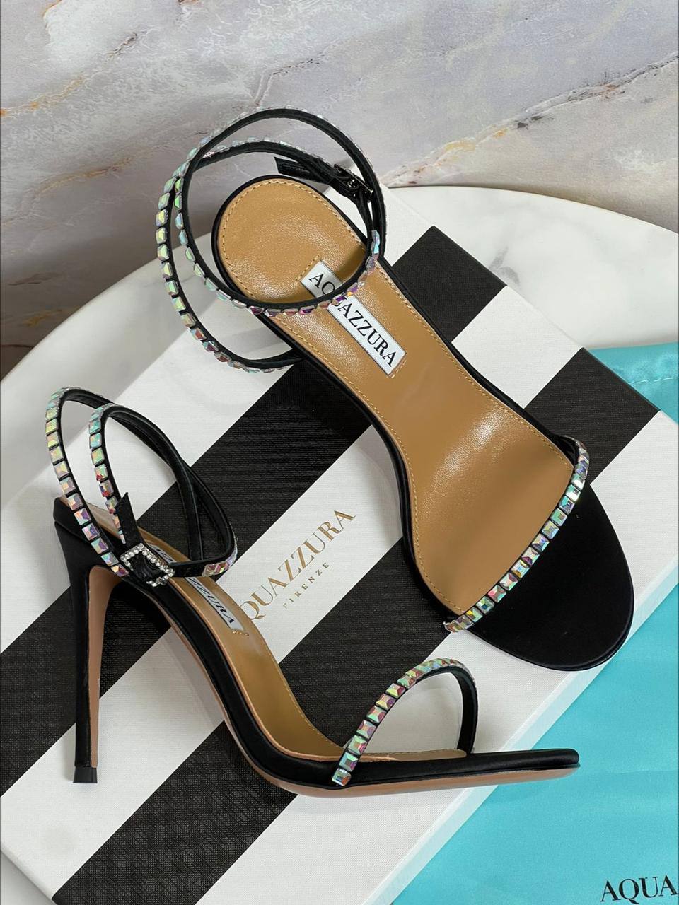 Босоножки Aquazzura Firenze LUX-116791 — это элегантная обувь на высоком каблуке, выполненная в черном цвете. Тонкие ремешки украшены переливающимися камнями, что придает им изысканный вид. Идеальный выбор для особых случаев и вечерних выходов.