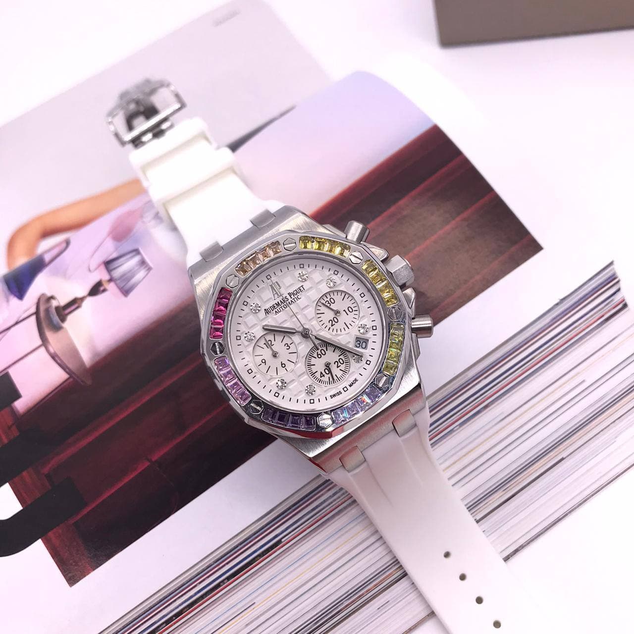 Audemars Piguet Часы LUX-54219 — это изысканный хронограф, отличающийся роскошным дизайном. Белый ремешок в сочетании с серебристым корпусом и циферблатом, украшенным разноцветными драгоценными камнями вокруг безеля, придает часам утонченный и элегантный вид. Этот аксессуар подчеркнет ваш безупречный вкус и станет ярким акцентом любого образа.