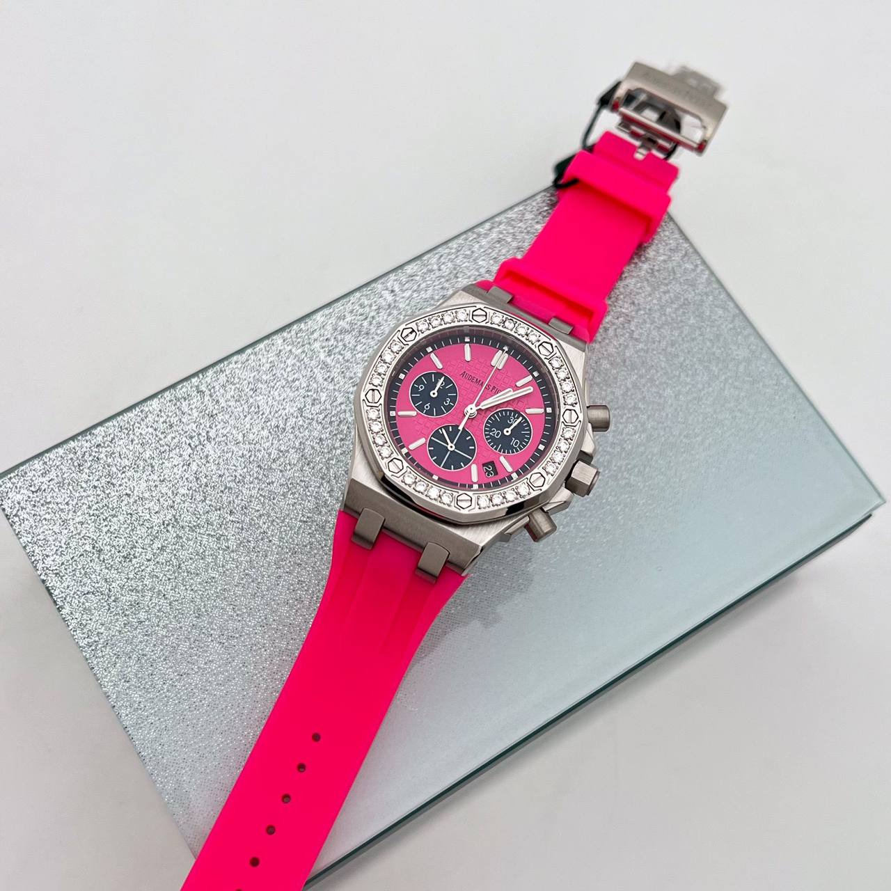 Часы Audemars Piguet LUX-104210 представляют собой изысканный хронограф, сочетающий в себе роскошь и современный дизайн. Розовый циферблат с тремя дополнительными циферблатами и инкрустация бриллиантами на безеле, создают яркий и элегантный внешний вид. Неоновый розовый ремешок придает часам спортивный характер, подчеркивая их оригинальность и стиль.