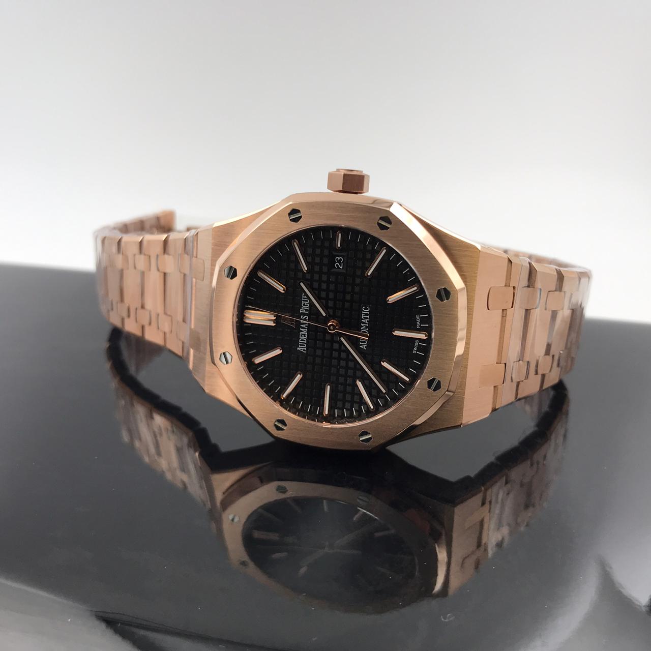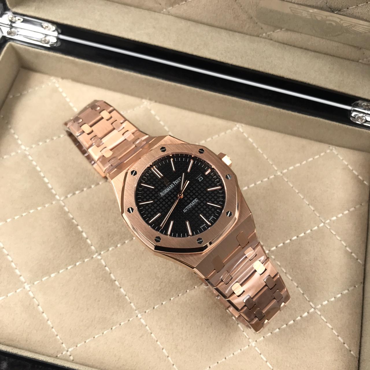 Audemars Piguet Часы мужские LUX-26711 – это элегантные мужские часы, сочетающие в себе классический дизайн и современную функциональность. Розовое золото корпуса и браслета придает изделию роскошный вид, а черный циферблат с текстурным узором и четкими метками обеспечивает отличную читаемость.