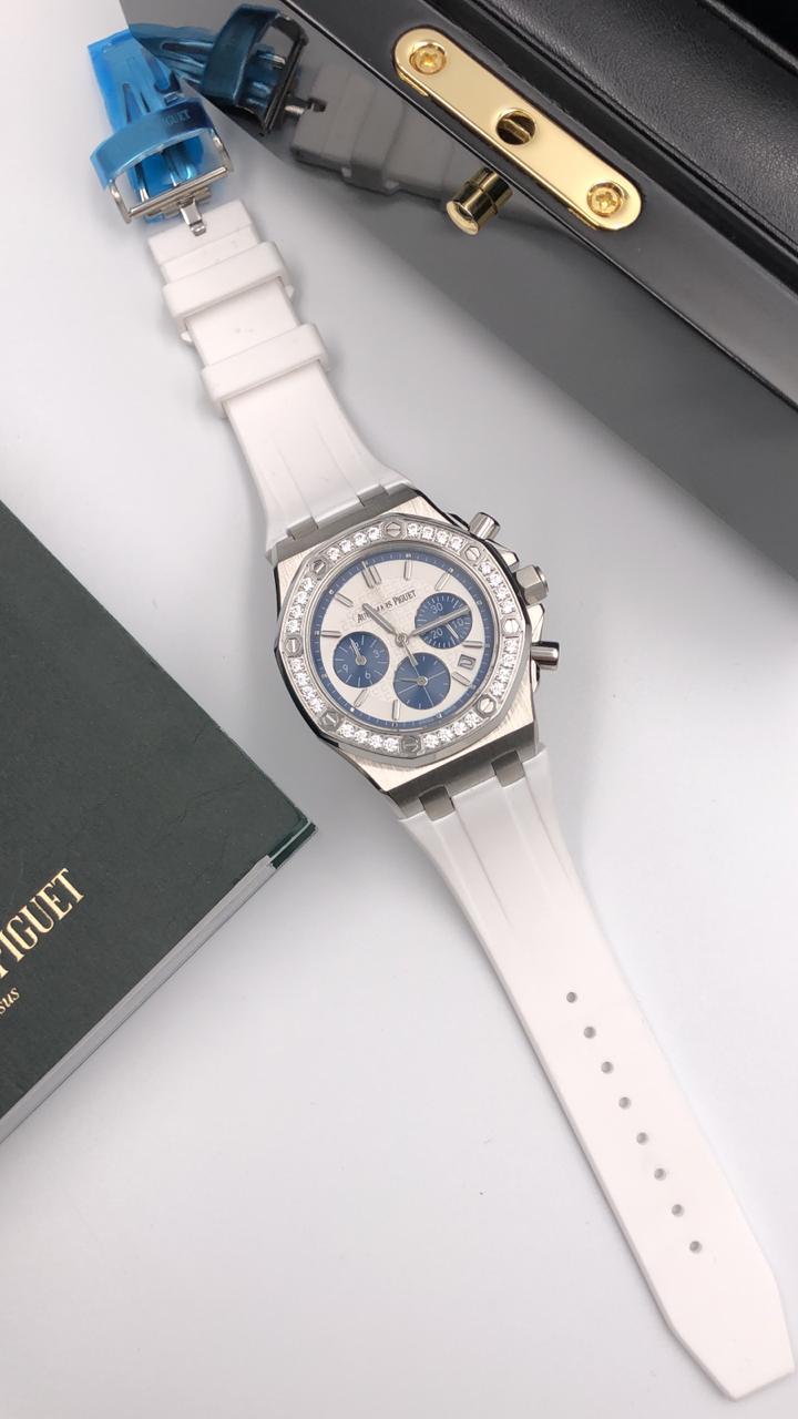 Audemars Piguet Часы Женские LUX-21401 — это элегантный аксессуар, сочетающий классический дизайн с современными деталями. Белый каучуковый ремешок и корпус, инкрустированный кристаллами, подчеркивают изысканность модели, а синий циферблат с хронографом придает спортивный акцент. Эти часы станут идеальным дополнением к любому образу, от повседневного до вечернего.